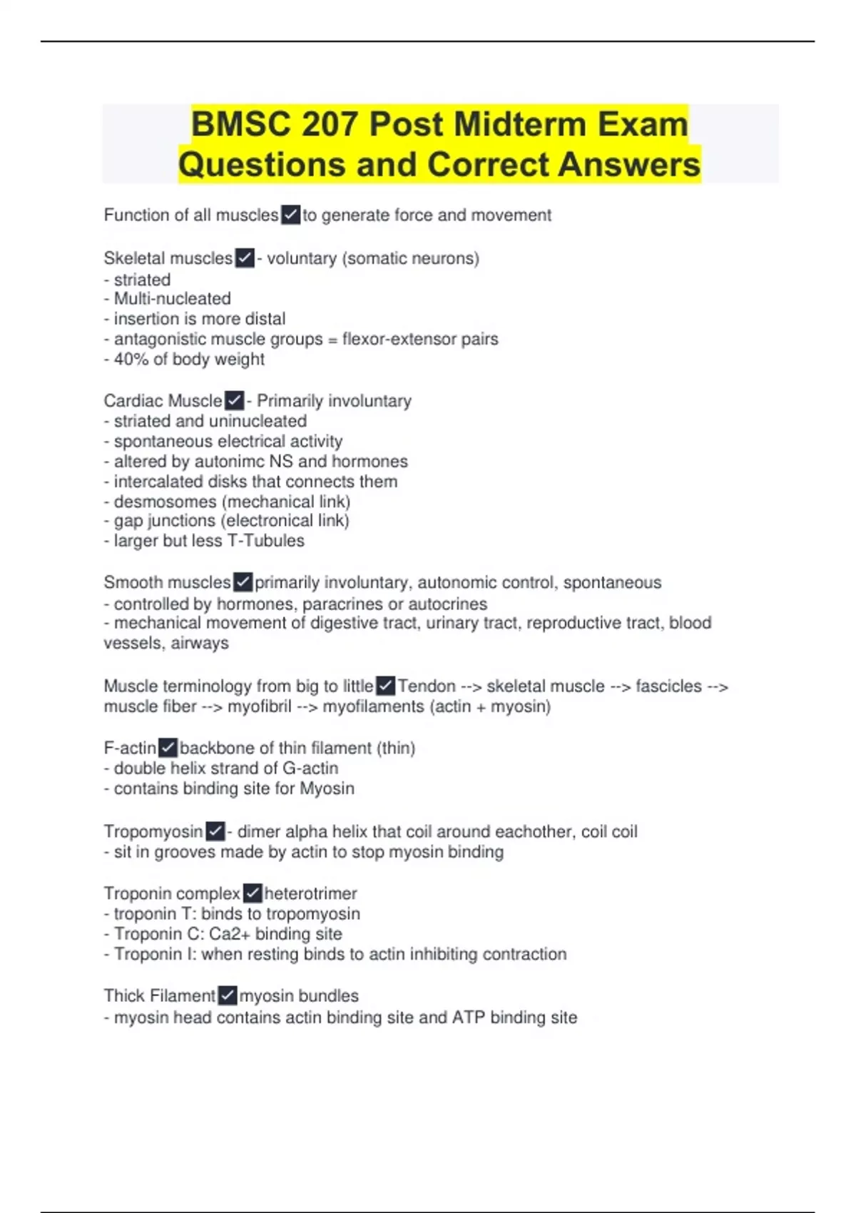 Function of all musclesto generate force and movement Skeletal muscles- voluntary (somatic neurons) - striated - Multi-nucleated - insertion is more distal - antagonistic muscle groups = flexor-extensor pairs - 40% of body weight Cardiac Muscle- Primarily involuntary - striated and uninucleated - spontaneous electrical activity - altered by autonimc NS and hormones - intercalated disks that connects them - desmosomes (mechanical link) - gap junctions (electronical link) - larger but less T-Tubules Smooth musclesprimarily involuntary, autonomic control, spontaneous - controlled by hormones, paracrines or autocrines - mechanical movement of digestive tract, urinary tract, reproductive tract, blood vessels, airways Muscle terminology from big to littleTendon --> skeletal muscle --> fascicles --> muscle fiber --> myofibril --> myofilaments (actin + myosin) F-actinbackbone of thin filament (thin) - double helix strand of G-actin - contains binding site for Myosin Tropomyosin- dimer alpha helix that coil around eachother, coil coil - sit in grooves made by actin to stop myosin binding Troponin complexheterotrimer - troponin T: binds to tropomyosin - Troponin C: Ca2+ binding site - Troponin I: when resting binds to actin inhibiting contraction Thick Filamentmyosin bundles - myosin head contains actin binding site and ATP binding site