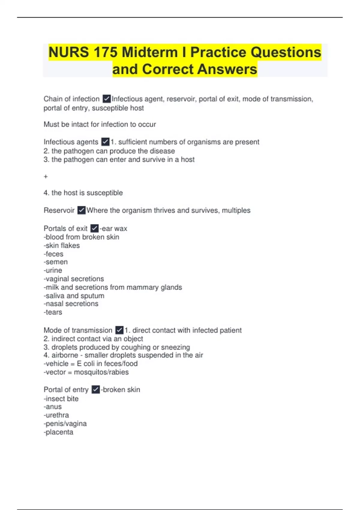 NURS 175 Midterm I Practice Questions and Correct Answers