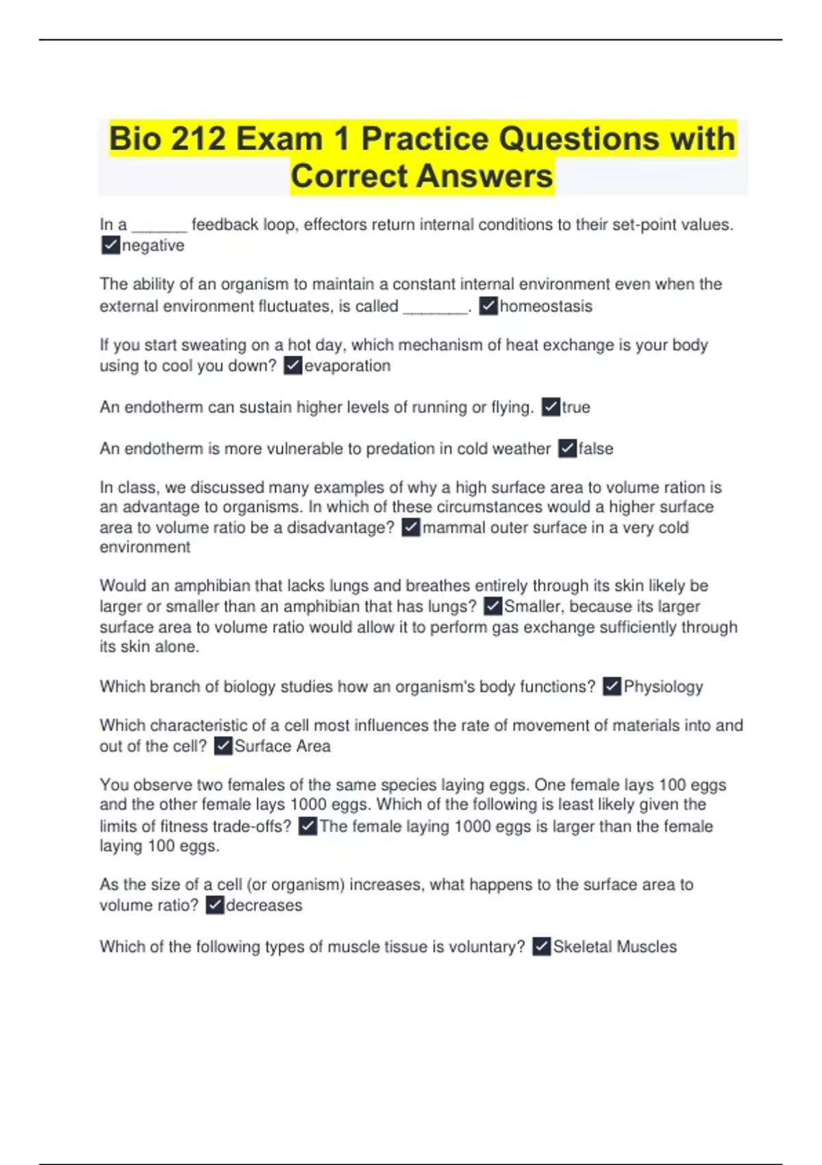 Bio 212 Exam 1 Practice Questions with Correct Answers