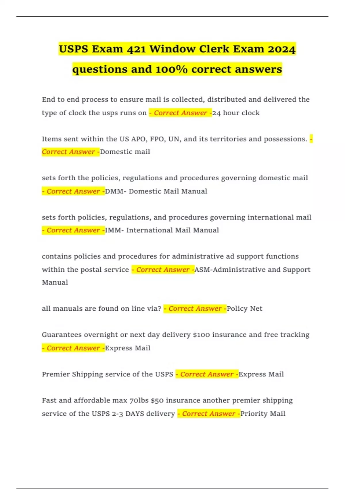 USPS Exam 421 Window Clerk Exam 2024 questions and 100% correct answers End to end process to ensure mail is collected, distributed and delivered the type of clock the usps runs on - Correct Answer -24 hour clock Items sent within the US APO, FPO, UN, and its territories and possessions. - Correct Answer -Domestic mail sets forth the policies, regulations and procedures governing domestic mail - Correct Answer -DMM- Domestic Mail Manual sets forth policies, regulations, and procedures governing international mail - Correct Answer -IMM- International Mail Manual