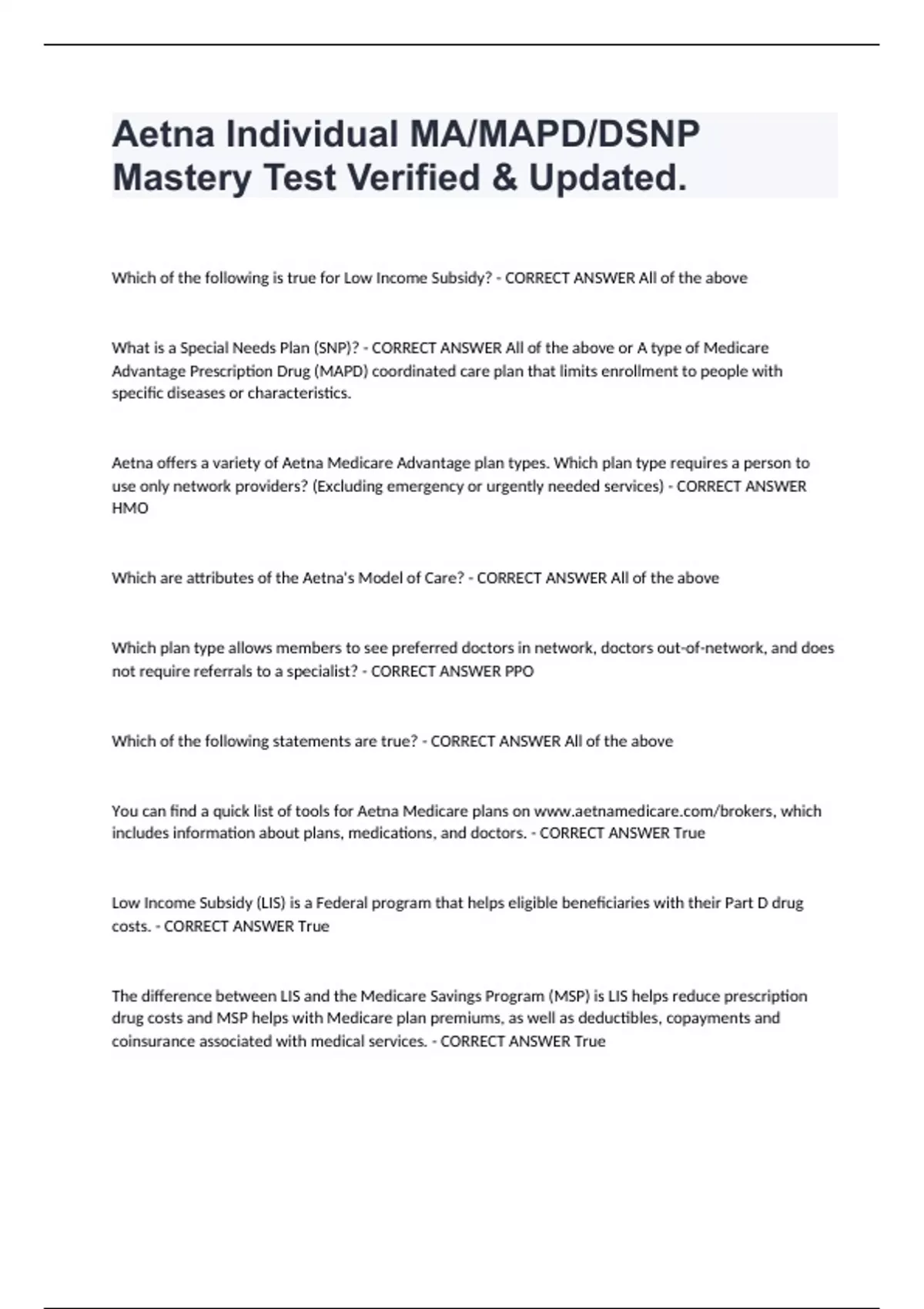 Aetna Individual MA/MAPD/DSNP Mastery Test Verified & Updated. Which of the following is true for Low Income Subsidy? - CORRECT ANSWER All of the above What is a Special Needs Plan (SNP)? - CORRECT ANSWER All of the above or A type of Medicare Advantage Prescription Drug (MAPD) coordinated care plan that limits enrollment to people with specific diseases or characteristics. Aetna offers a variety of Aetna Medicare Advantage plan types. Which plan type requires a person to use only network providers? (Excluding emergency or urgently needed services) - CORRECT ANSWER HMO Which are attributes of the Aetna's Model of Care? - CORRECT ANSWER All of the above Which plan type allows members to see preferred doctors in network, doctors out-of-network, and does not require referrals to a specialist? - CORRECT ANSWER PPO Which of the following statements are true? - CORRECT ANSWER All of the above You can find a quick list of tools for Aetna Medicare plans on Low Income Subsidy (LIS) is a Federal program that helps eligible beneficiaries with their Part D drug costs. - CORRECT ANSWER True The difference between LIS and the Medicare Savings Program (MSP) is LIS helps reduce prescription drug costs and MSP helps with Medicare plan premiums, as well as deductibles, copayments and coinsurance associated with medical services. - CORRECT ANSWER True