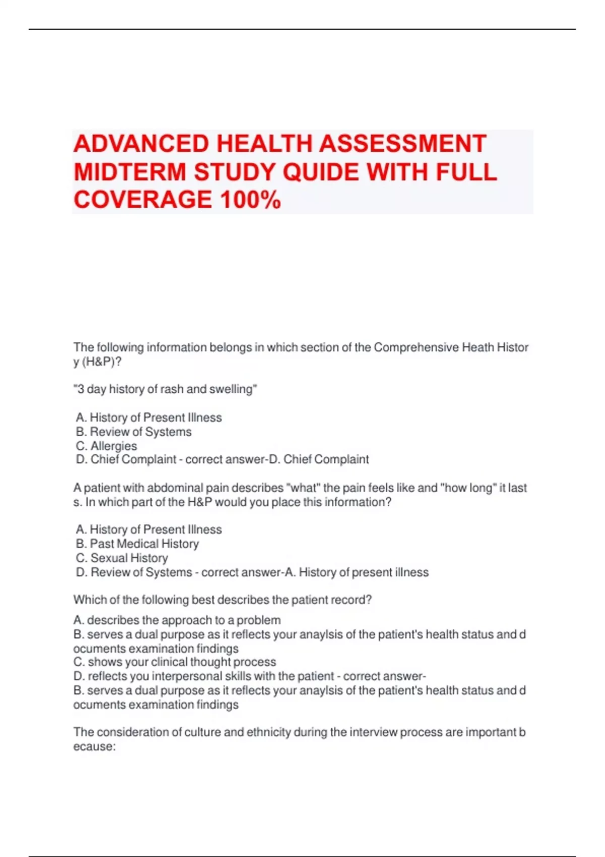 ADVANCED HEALTH ASSESSMENT MIDTERM STUDY QUIDE WITH FULL COVERAGE 100%