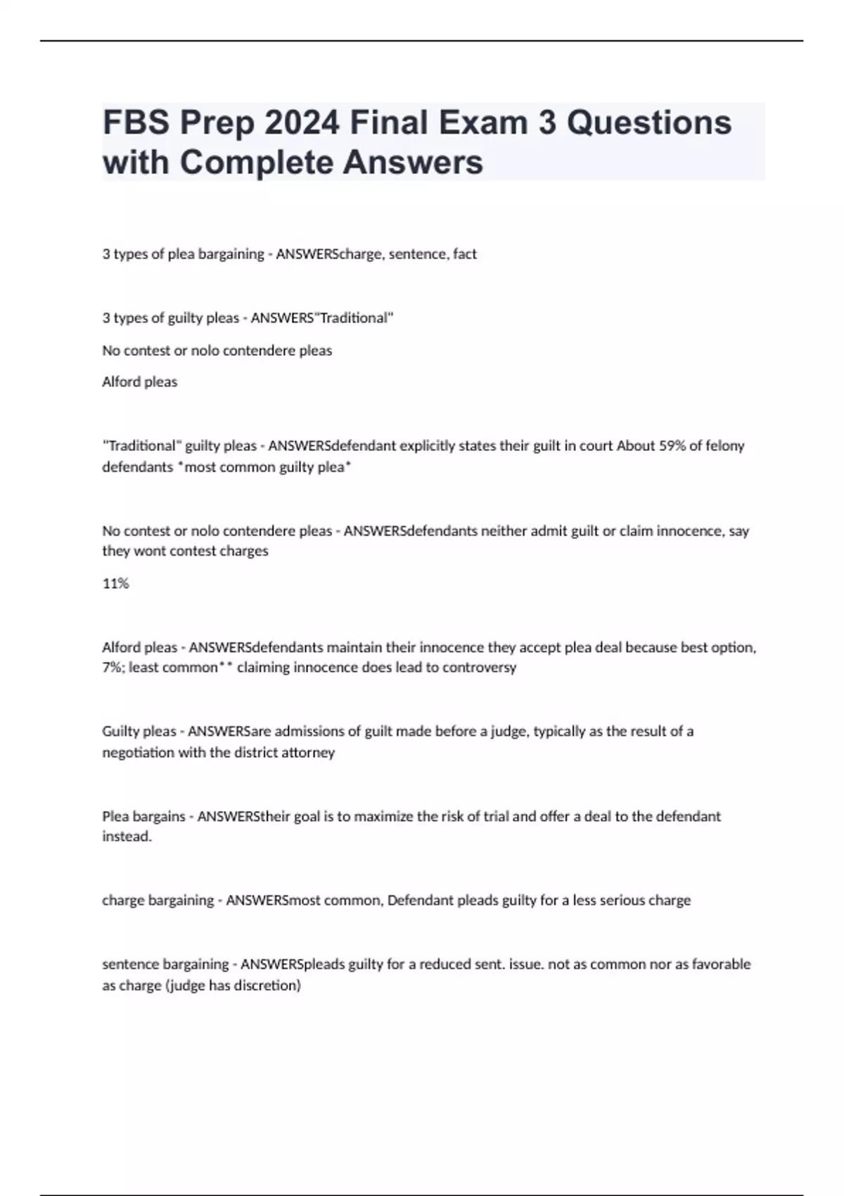 FBS Prep 2024 Final Exam 3 Questions with Complete Answers 3 types of plea bargaining - ANSWERScharge, sentence, fact 3 types of guilty pleas - ANSWERS"Traditional" No contest or nolo contendere pleas Alford pleas "Traditional" guilty pleas - ANSWERSdefendant explicitly states their guilt in court About 59% of felony defendants *most common guilty plea* No contest or nolo contendere pleas - ANSWERSdefendants neither admit guilt or claim innocence, say they wont contest charges 11% Alford pleas - ANSWERSdefendants maintain their innocence they accept plea deal because best option, 7%; least common** claiming innocence does lead to controversy Guilty pleas - ANSWERSare admissions of guilt made before a judge, typically as the result of a negotiation with the district attorney Plea bargains - ANSWERStheir goal is to maximize the risk of trial and offer a deal to the defendant instead. charge bargaining - ANSWERSmost common, Defendant pleads guilty for a less serious charge sentence bargaining - ANSWERSpleads guilty for a reduced sent. issue. not as common nor as favorable as charge (judge has discretion)