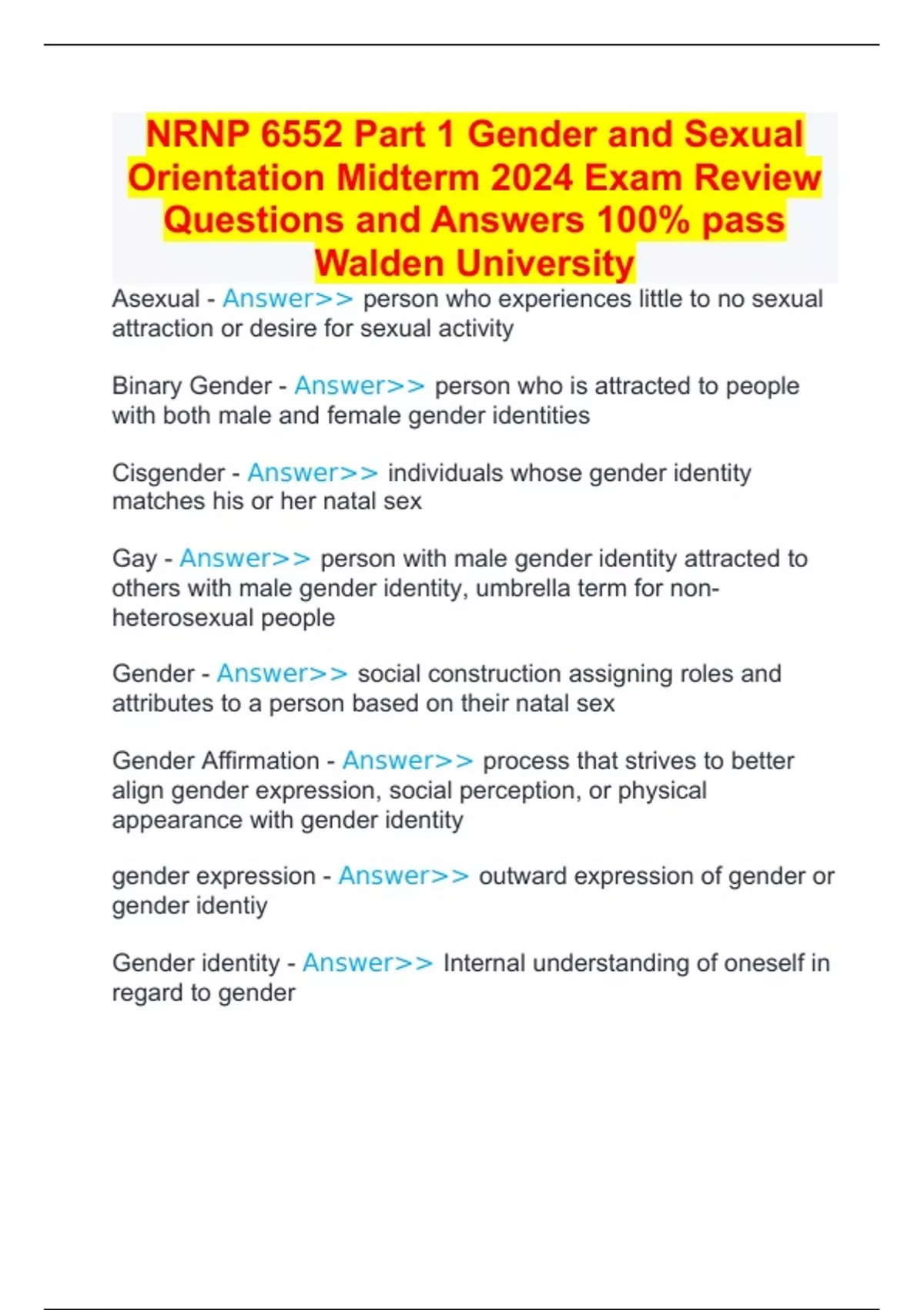NRNP 6552 Part 1 Gender and Sexual Orientation Midterm 2024 Exam Review Questions and Answers 100% pass Walden University