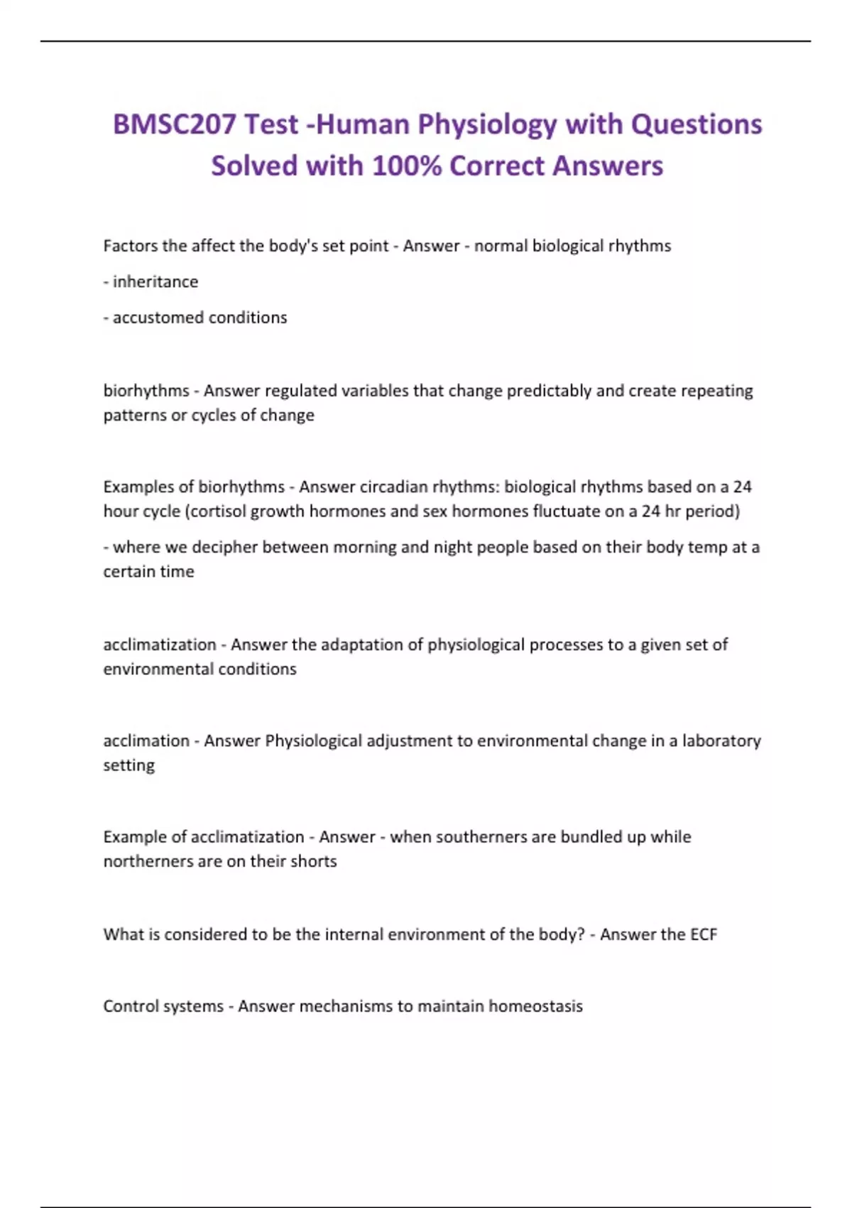 BMSC207 Test -Human Physiology with Questions Solved with 100% Correct Answers