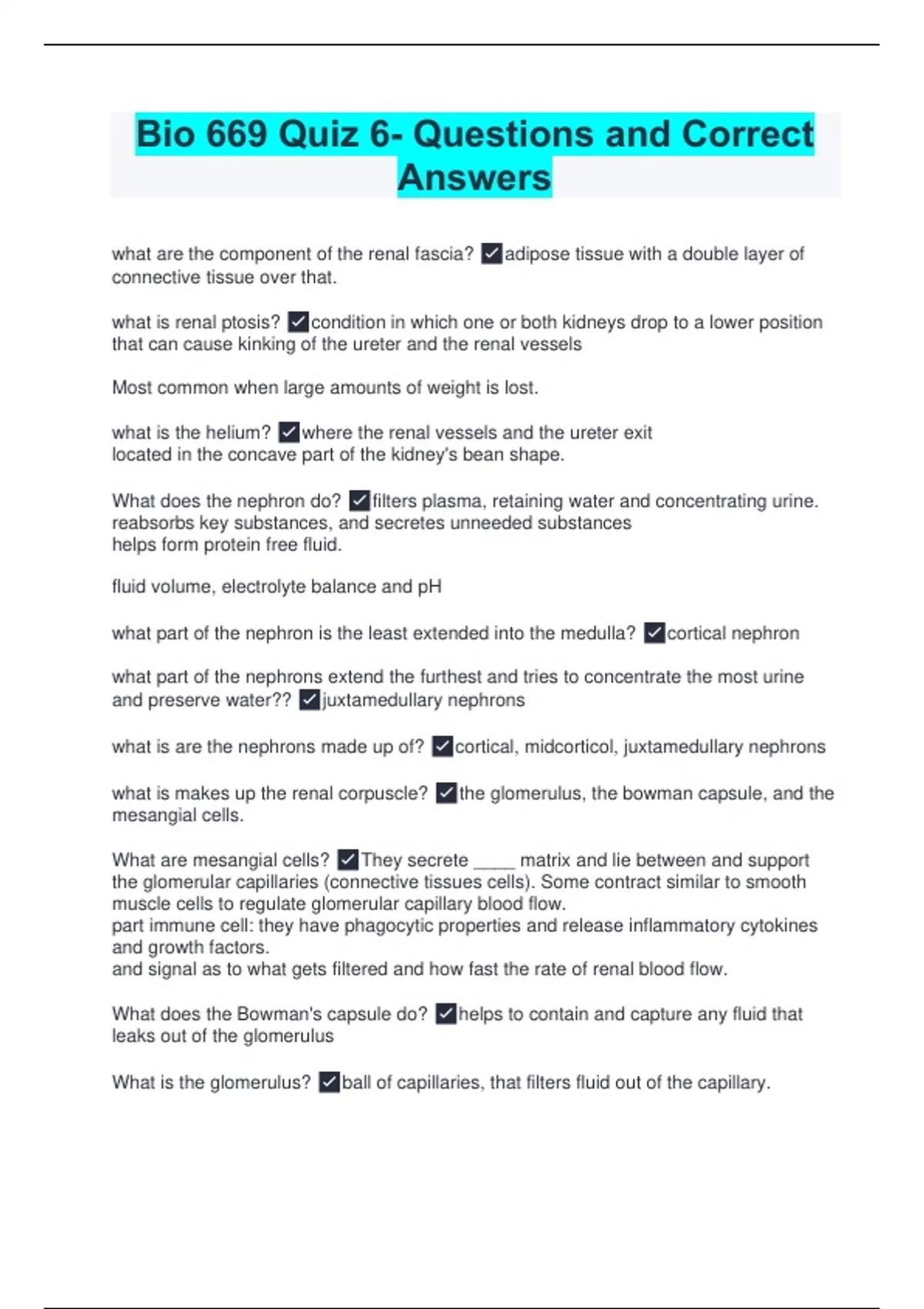 what are the component of the renal fascia? adipose tissue with a double layer of connective tissue over that. what is renal ptosis? condition in which one or both kidneys drop to a lower position that can cause kinking of the ureter and the renal vessels Most common when large amounts of weight is lost. what is the helium? where the renal vessels and the ureter exit located in the concave part of the kidney's bean shape. What does the nephron do? filters plasma, retaining water and concentrating urine. reabsorbs key substances, and secretes unneeded substances helps form protein free fluid. fluid volume, electrolyte balance and pH what part of the nephron is the least extended into the medulla? cortical nephron what part of the nephrons extend the furthest and tries to concentrate the most urine and preserve water?? juxtamedullary nephrons what is are the nephrons made up of? cortical, midcorticol, juxtamedullary nephrons what is makes up the renal corpuscle? the glomerulus, the bowman capsule, and the mesangial cells. What are mesangial cells? They secrete ____ matrix and lie between and support the glomerular capillaries (connective tissues cells). Some contract similar to smooth muscle cells to regulate glomerular capillary blood flow. part immune cell: they have phagocytic properties and release inflammatory cytokines and growth factors. and signal as to what gets filtered and how fast the rate of renal blood flow. What does the Bowman's capsule do? helps to contain and capture any fluid that leaks out of the glomerulus What is the glomerulus? ball of capillaries, that filters fluid out of the capillary.