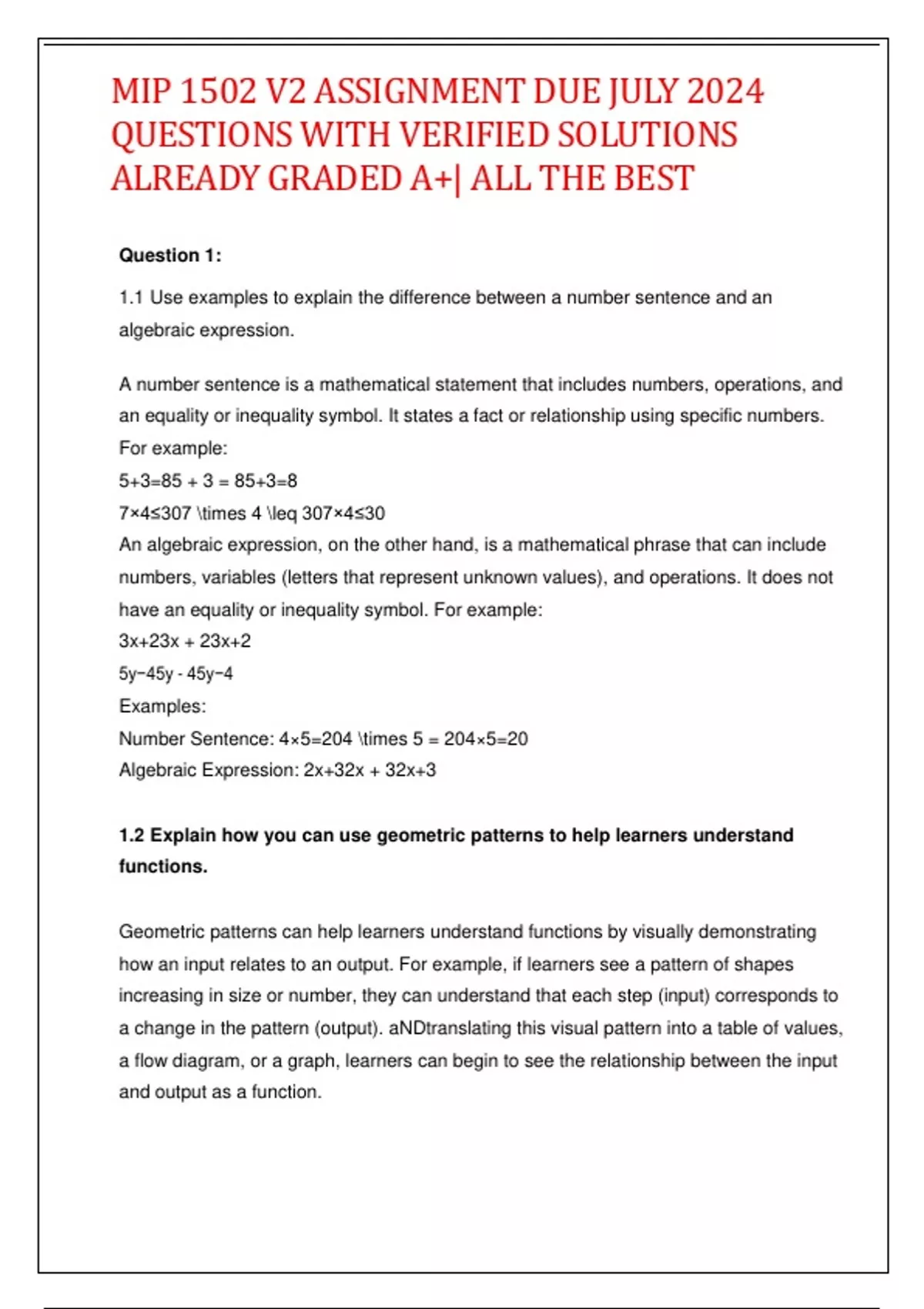 MIP 1502 V2 ASSIGNMENT DUE JULY 2024 QUESTIONS WITH VERIFIED SOLUTIONS ALREADY GRADED A+| ALL THE BEST
