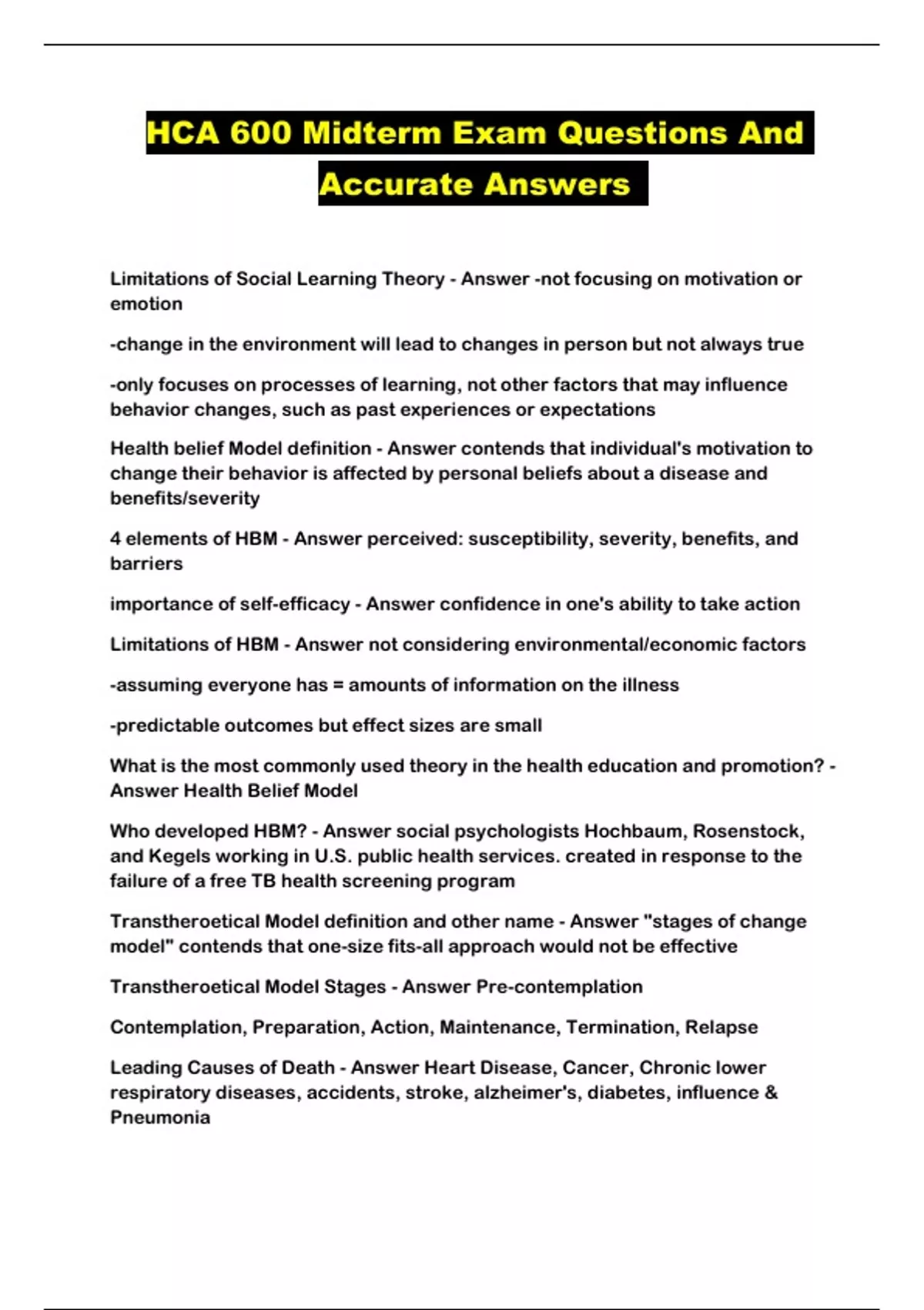 HCA 600 Midterm Exam Questions And Accurate Answers Limitations of Social Learning Theory - Answer -not focusing on motivation o r emotion -change in the environment will lead to changes in person but not always true -only focuses on processes of learning, not other factors that may influence behavior changes, such as past experiences or expectations Health belief Model definition - Answer contends that individual's motivation t o change their behavior is affected by personal beliefs about a disease and benefits/severity 4 elements of HBM - Answer perceived: susceptibility, severity, benefits, and barriers importance of self-efficacy - Answer confidence in one's ability to take action Limitations of HBM - Answer not considering environmental/economic fact ors -assuming everyone has = amounts of information on the illness -predictable outcomes but effect sizes are small What is the most commonly used theory in the health education and promot ion? - Answer Health Belief Model Who developed HBM? - Answer social psychologists Hochbaum, Rosenstock, and Kegels working in U.S. public health services. created in response to the failure of a free TB health screening program Transtheroetical Model definition and other name - Answer "stages of chang e model" contends that one-size fits-all approach would not be effective Transtheroetical Model Stages - Answer Pre-contemplation Contemplation, Preparation, Action, Maintenance, Termination, Relapse Leading Causes of Death - Answer Heart Disease, Cancer, Chronic lower respiratory diseases, accidents, stroke, alzheimer's, diabetes, influence & Pneumonia