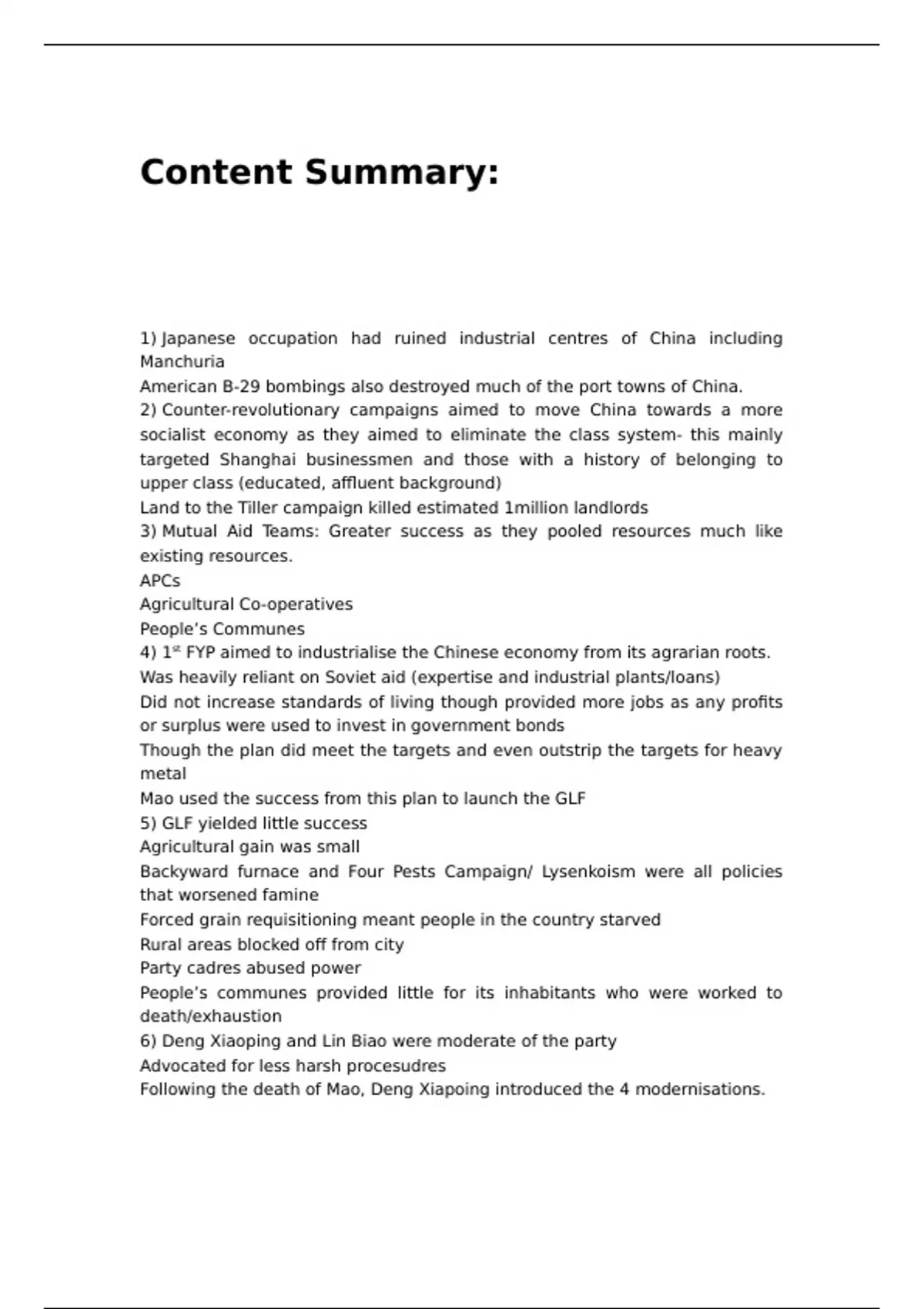 4) 1st FYP aimed to industrialise the Chinese economy from its agrarian roots.