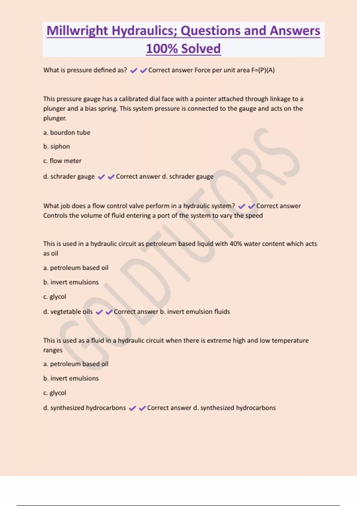 Millwright Hydraulics; Questions and Answers 100% Solved What is pressure defined as? Correct answer Force per unit area F=(P)(A) This pressure gauge has a calibrated dial face with a pointer attached through linkage to a plunger and a bias spring. This system pressure is connected to the gauge and acts on the plunger. a. bourdon tube b. siphon c. flow meter d. schrader gauge Correct answer d. schrader gauge