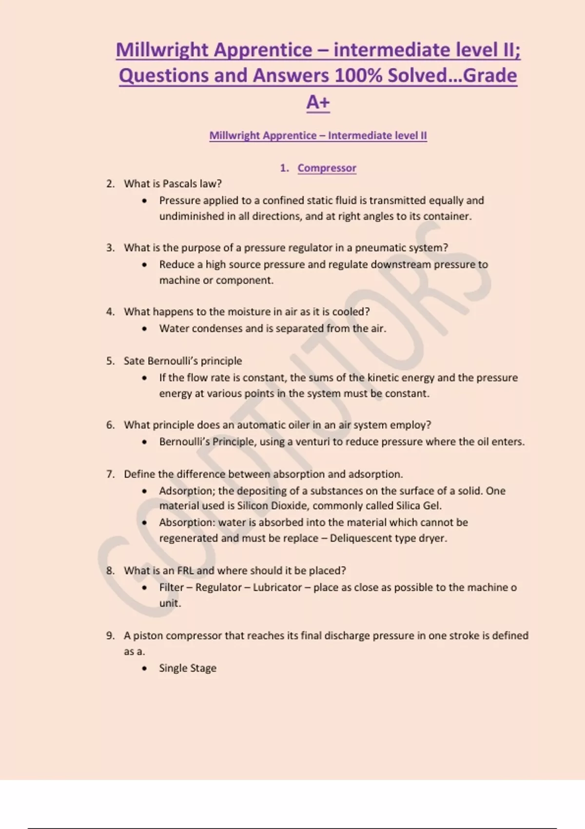Millwright Apprentice – intermediate level II; Questions and Answers 100% Solved…Grade A+ Millwright Apprentice – Intermediate level II 1. Compressor 2. What is Pascals law? • Pressure applied to a confined static fluid is transmitted equally and undiminished in all directions, and at right angles to its container. 3. What is the purpose of a pressure regulator in a pneumatic system? • Reduce a high source pressure and regulate downstream pressure to machine or component. 4. What happens to the moisture in air as it is cooled? • Water condenses and is separated from the air. 5. Sate Bernoulli’s principle • If the flow rate is constant, the sums of the kinetic energy and the pressure energy at various points in the system must be constant