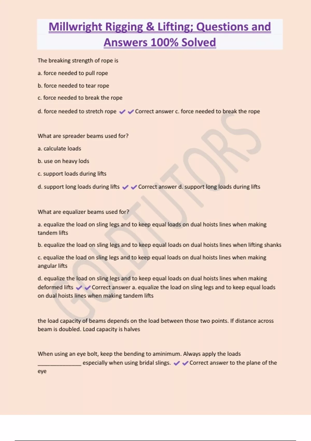 Millwright Rigging & Lifting; Questions and Answers 100% Solved The breaking strength of rope is a. force needed to pull rope b. force needed to tear rope c. force needed to break the rope d. force needed to stretch rope Correct answer c. force needed to break the rope What are spreader beams used for? a. calculate loads b. use on heavy lods c. support loads during lifts d. support long loads during lifts Correct answer d. support long loads during lifts