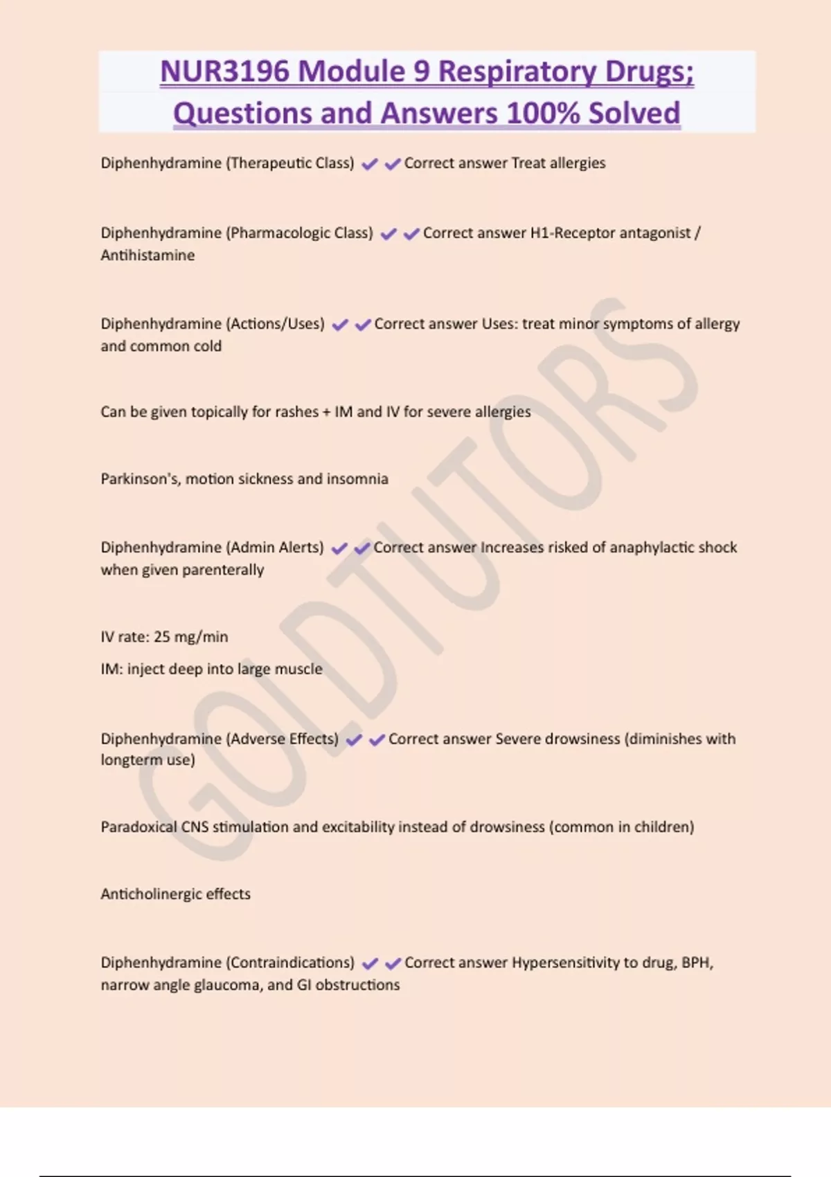 NUR3196 Module 9 Respiratory Drugs; Questions and Answers 100% Solved Diphenhydramine (Therapeutic Class) Correct answer Treat allergies Diphenhydramine (Pharmacologic Class) Correct answer H1-Receptor antagonist / Antihistamine Diphenhydramine (Actions/Uses) Correct answer Uses: treat minor symptoms of allergy and common cold Can be given topically for rashes + IM and IV for severe allergies Parkinson's, motion sickness and insomnia