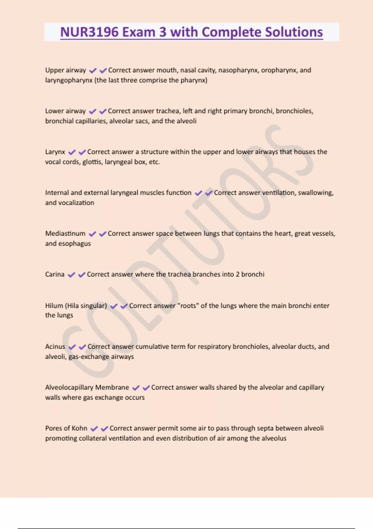 NUR3196 Exam 3 with Complete Solutions Upper airway Correct answer mouth, nasal cavity, nasopharynx, oropharynx, and laryngopharynx (the last three comprise the pharynx) Lower airway Correct answer trachea, left and right primary bronchi, bronchioles, bronchial capillaries, alveolar sacs, and the alveoli Larynx Correct answer a structure within the upper and lower airways that houses the vocal cords, glottis, laryngeal box, etc. Internal and external laryngeal muscles function Correct answer ventilation, swallowing, and vocalization Mediastinum Correct answer space between lungs that contains the heart, great vessels, and esophagus