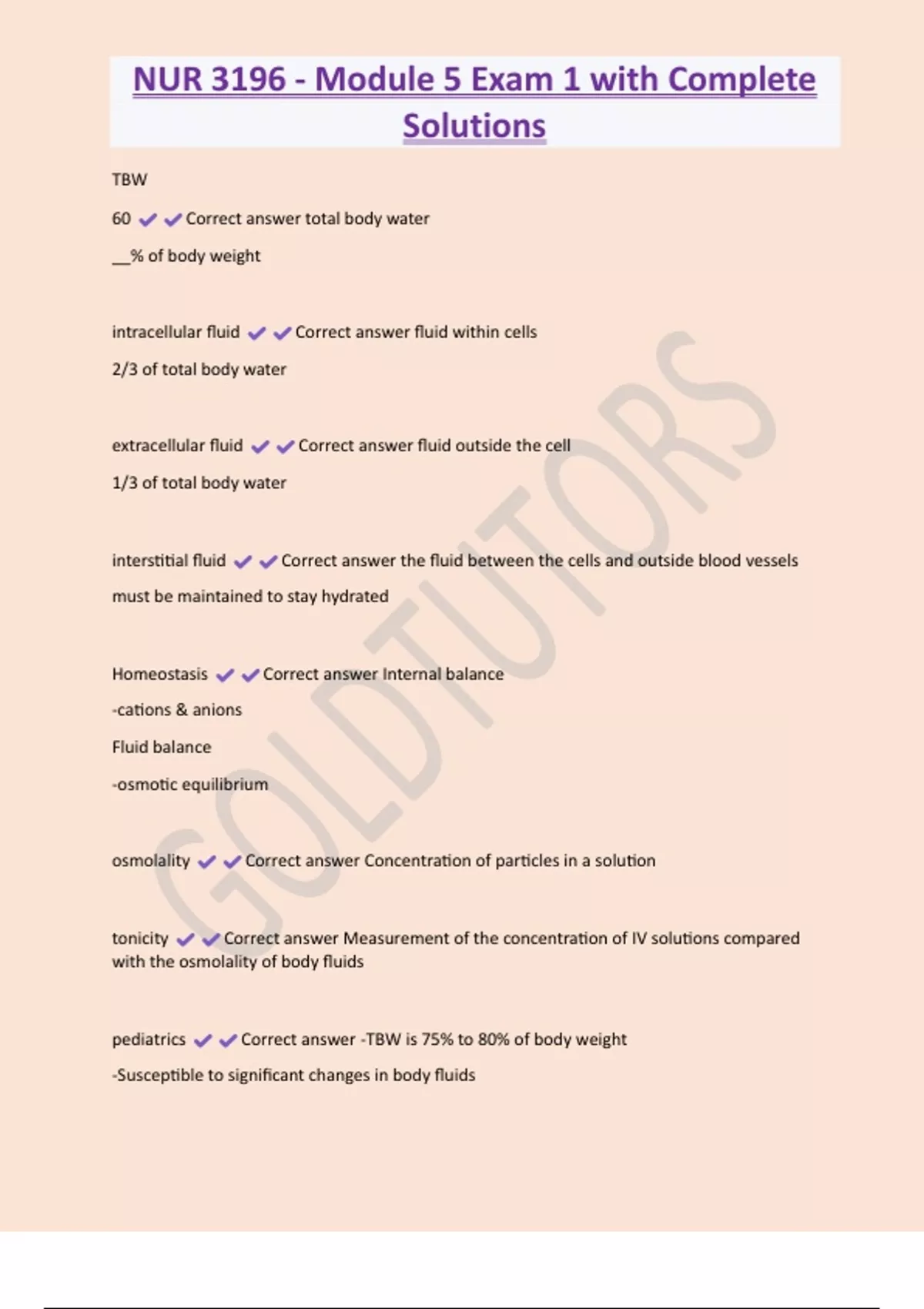 NUR 3196 - Module 5 Exam 1 with Complete Solutions TBW 60 Correct answer total body water __% of body weight intracellular fluid Correct answer fluid within cells 2/3 of total body water extracellular fluid Correct answer fluid outside the cell 1/3 of total body water interstitial fluid Correct answer the fluid between the cells and outside blood vessels must be maintained to stay hydrated Homeostasis Correct answer Internal balance