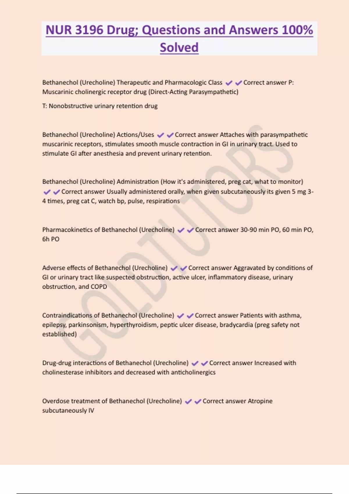 NUR 3196 Drug; Questions and Answers 100% Solved Bethanechol (Urecholine) Therapeutic and Pharmacologic Class Correct answer P: Muscarinic cholinergic receptor drug (Direct-Acting Parasympathetic) T: Nonobstructive urinary retention drug Bethanechol (Urecholine) Actions/Uses Correct answer Attaches with parasympathetic muscarinic receptors, stimulates smooth muscle contraction in GI in urinary tract. Used to stimulate GI after anesthesia and prevent urinary retention.