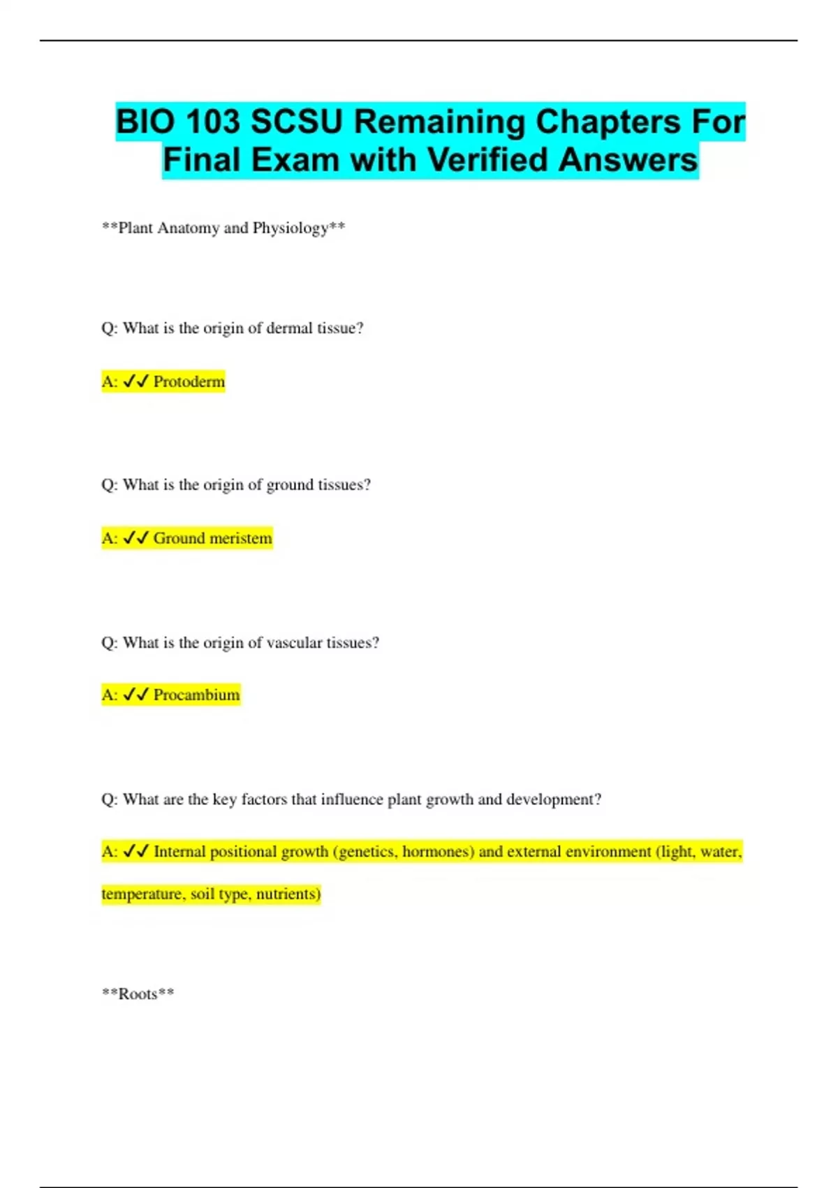 BIO 103 SCSU Remaining Chapters For Final Exam with Verified Answers **Plant Anatomy and Physiology** Q: What is the origin of dermal tissue? A: Protoderm Q: What is the origin of ground tissues? A: Ground meristem Q: What is the origin of vascular tissues? A: Procambium Q: What are the key factors that influence plant growth and development? A: Internal positional growth (genetics, hormones) and external environment (light, water, temperature, soil type, nutrients) **Roots** Q: What are the different regions of a root? A: Root cap, cell division (root apical meristem), cell elongation (between root hairs and meristem), maturation (root hairs) Q: What are the different layers of root tissue? A: Epidermis, cortex, endodermis, pericycle, vascular tissue (xylem and phloem) **Stem and Leaf** Q: How do plants grow in response to light? A: Phototropism (growth towards light) Q: How do plants respond to darkness and shading? A: Etiolation (growth in partial light or complete darkness) and shade avoidance (growth to reach more sunlight) Q: What are the basic plant tissue types organized in the 3 main plant organs? A: ... (list the different tissue layers in roots, stems, and leaves) **Vascular Tissue**