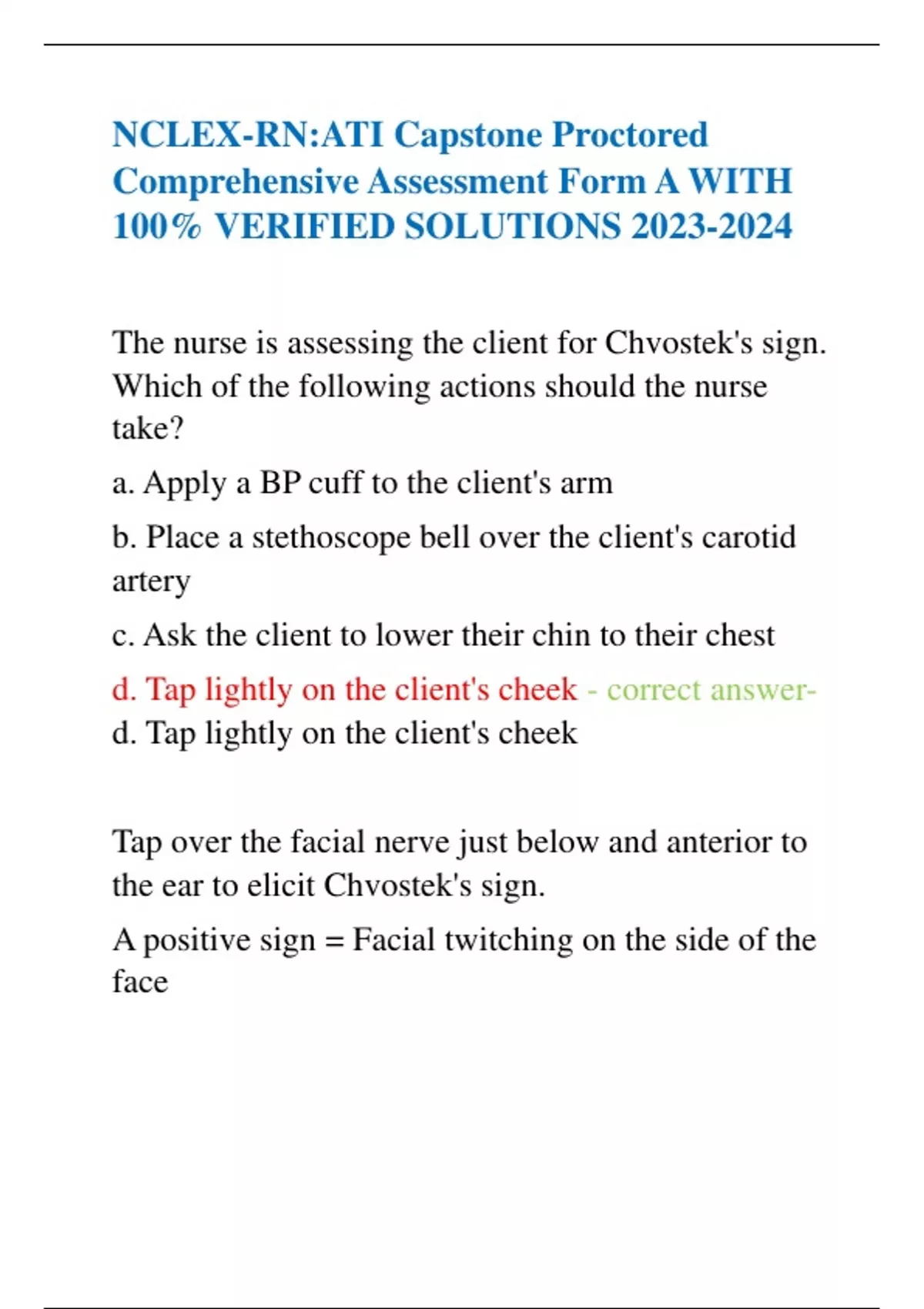 The nurse is assessing the client for Chvostek's sign. Which of the following actions should the nurse take? a. Apply a BP cuff to the client's arm b. Place a stethoscope bell over the client's carotid artery c. Ask the client to lower their chin to their chest d. Tap lightly on the client's cheek - correct answer-d. Tap lightly on the client's cheek Tap over the facial nerve just below and anterior to the ear to elicit Chvostek's sign. A positive sign = Facial twitching on the side of the face
