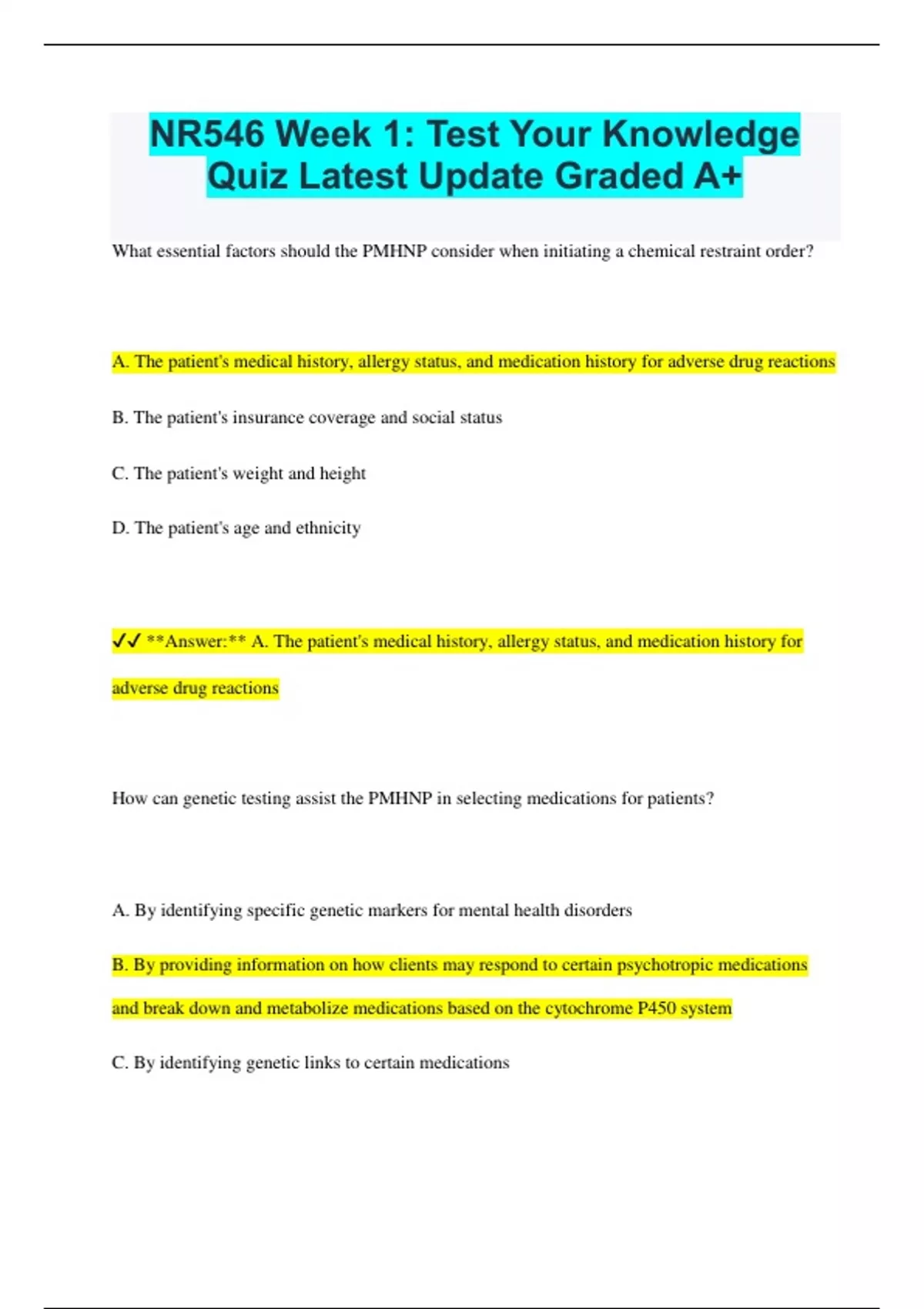 NR546 Week 1: Test Your Knowledge Quiz Latest Update Graded A+ What essential factors should the PMHNP consider when initiating a chemical restraint order? A. The patient's medical history, allergy status, and medication history for adverse drug reactions B. The patient's insurance coverage and social status C. The patient's weight and height D. The patient's age and ethnicity **Answer:** A. The patient's medical history, allergy status, and medication history for adverse drug reactions How can genetic testing assist the PMHNP in selecting medications for patients? A. By identifying specific genetic markers for mental health disorders B. By providing information on how clients may respond to certain psychotropic medications and break down and metabolize medications based on the cytochrome P450 system C. By identifying genetic links to certain medications D. By determining the client's ancestry and cultural background **Answer:** B. By providing information on how clients may respond to certain psychotropic medications and break down and metabolize medications based on the cytochrome P450 system Why do identical twins with 100% identical DNA not always develop the same mental health disorder? A. Because they have different lifestyles and environments B. Because they have different gene expression despite sharing identical DNA C. Because they have different brain structures D. Because they have different personalities **Answer:** B. Because they have different gene expression despite sharing identical DNA What is the main function of the cerebellum? A. Speech production B. Coordination C. Object identification D. Primary visual area **Answer:** B. Coordination wernicke's area speech comprehension occipital lobe primary visual area parietal lobe keeps us alert to what
