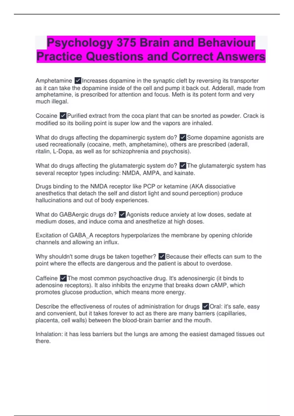 Psychology 375 Brain and Behaviour Practice Questions and Correct Answers