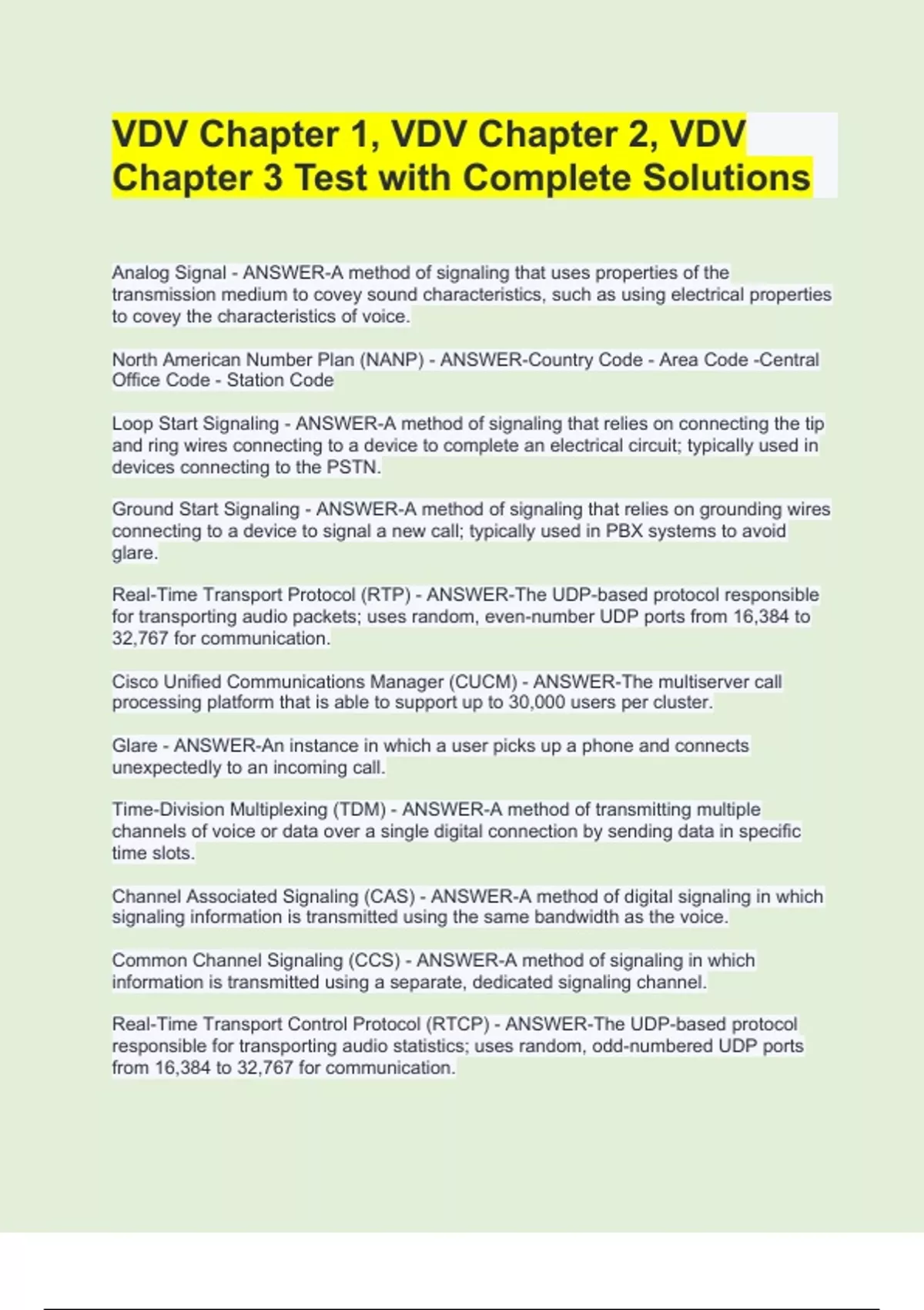VDV Chapter 1, VDV Chapter 2, VDV Chapter 3 Test with Complete SolutionsVDV Chapter 1, VDV Chapter 2, VDV Chapter 3 Test with Complete SolutionsVDV Chapter 1, VDV Chapter 2, VDV Chapter 3 Test with Complete SolutionsVDV Chapter 1, VDV Chapter 2, VDV Chapter 3 Test with Complete Solutions Analog Signal - ANSWER-A method of signaling that uses properties of the transmission medium to covey sound characteristics, such as using electrical properties to covey the characteristics of voice. North American Number Plan (NANP) - ANSWER-Country Code - Area Code -Central Office Code - Station Code Loop Start Signaling - ANSWER-A method of signaling that relies on connecting the tip and ring wires connecting to a device to complete an electrical circuit; typically used in