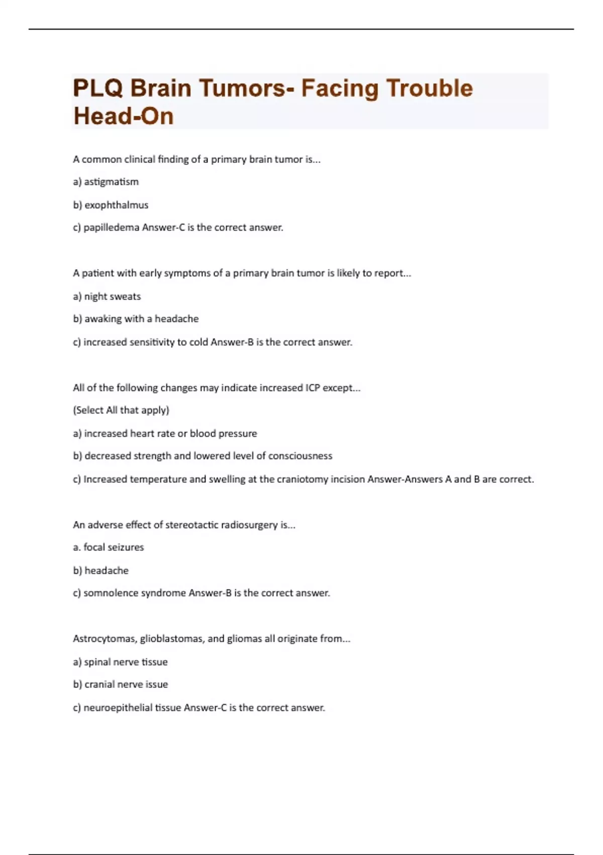 PLQ Brain Tumors- Facing Trouble Head-On Questions and Answers 100% Verified