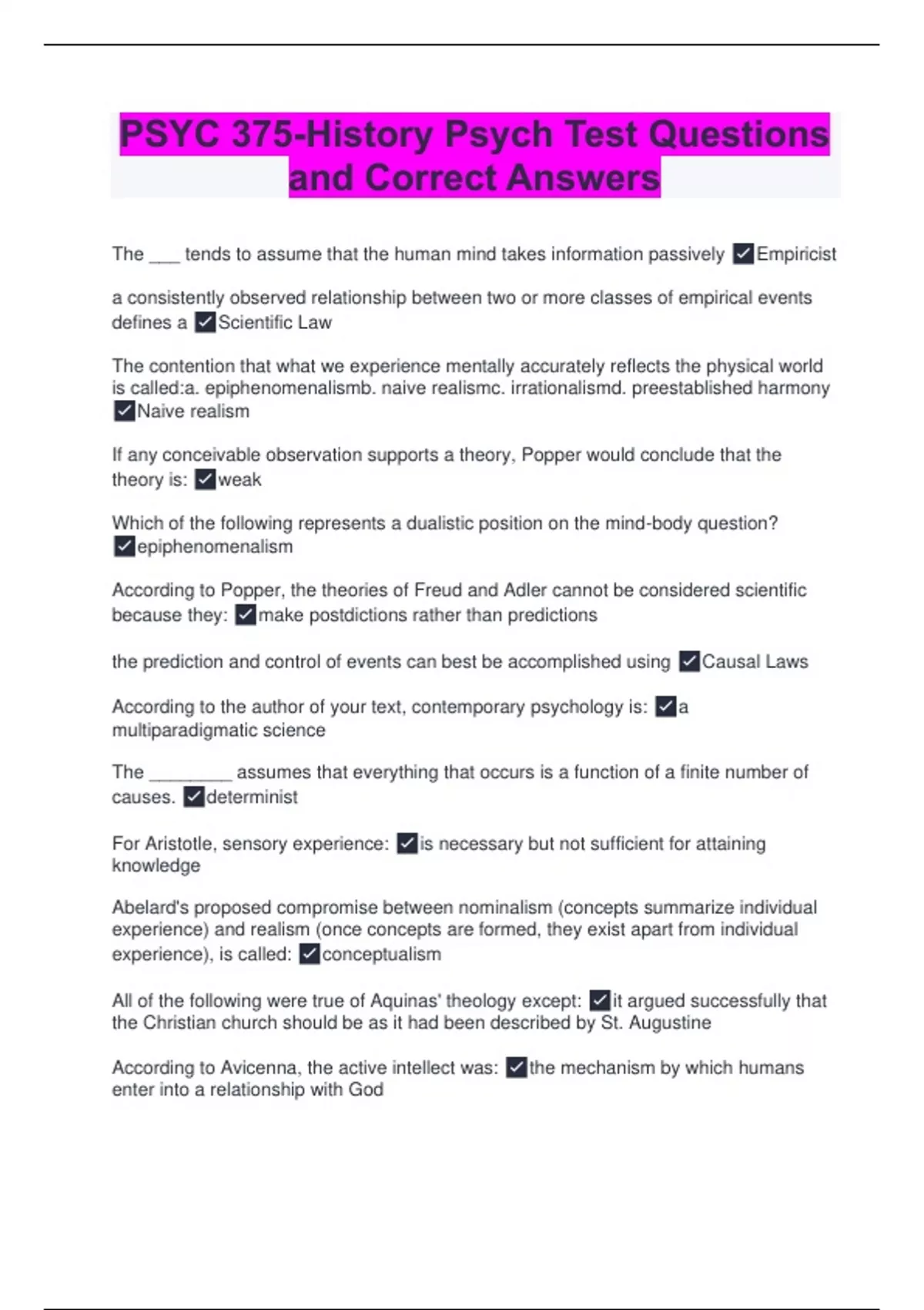 The ___ tends to assume that the human mind takes information passively Empiricist a consistently observed relationship between two or more classes of empirical events defines a Scientific Law The contention that what we experience mentally accurately reflects the physical world is called:a. epiphenomenalismb. naive realismc. irrationalismd. preestablished harmony Naive realism If any conceivable observation supports a theory, Popper would conclude that the theory is: weak Which of the following represents a dualistic position on the mind-body question? epiphenomenalism According to Popper, the theories of Freud and Adler cannot be considered scientific because they: make postdictions rather than predictions the prediction and control of events can best be accomplished using Causal Laws According to the author of your text, contemporary psychology is: a multiparadigmatic science The ________ assumes that everything that occurs is a function of a finite number of causes. determinist For Aristotle, sensory experience: is necessary but not sufficient for attaining knowledge Abelard's proposed compromise between nominalism (concepts summarize individual experience) and realism (once concepts are formed, they exist apart from individual experience), is called: conceptualism All of the following were true of Aquinas' theology except: it argued successfully that the Christian church should be as it had been described by St. Augustine According to Avicenna, the active intellect was: the mechanism by which humans enter into a relationship with God