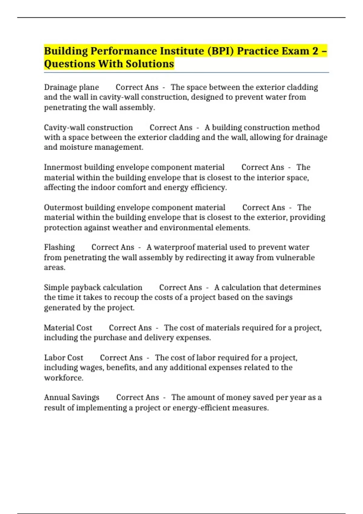 Building Performance Institute (BPI) Practice Exam 2 – Questions With Solutions