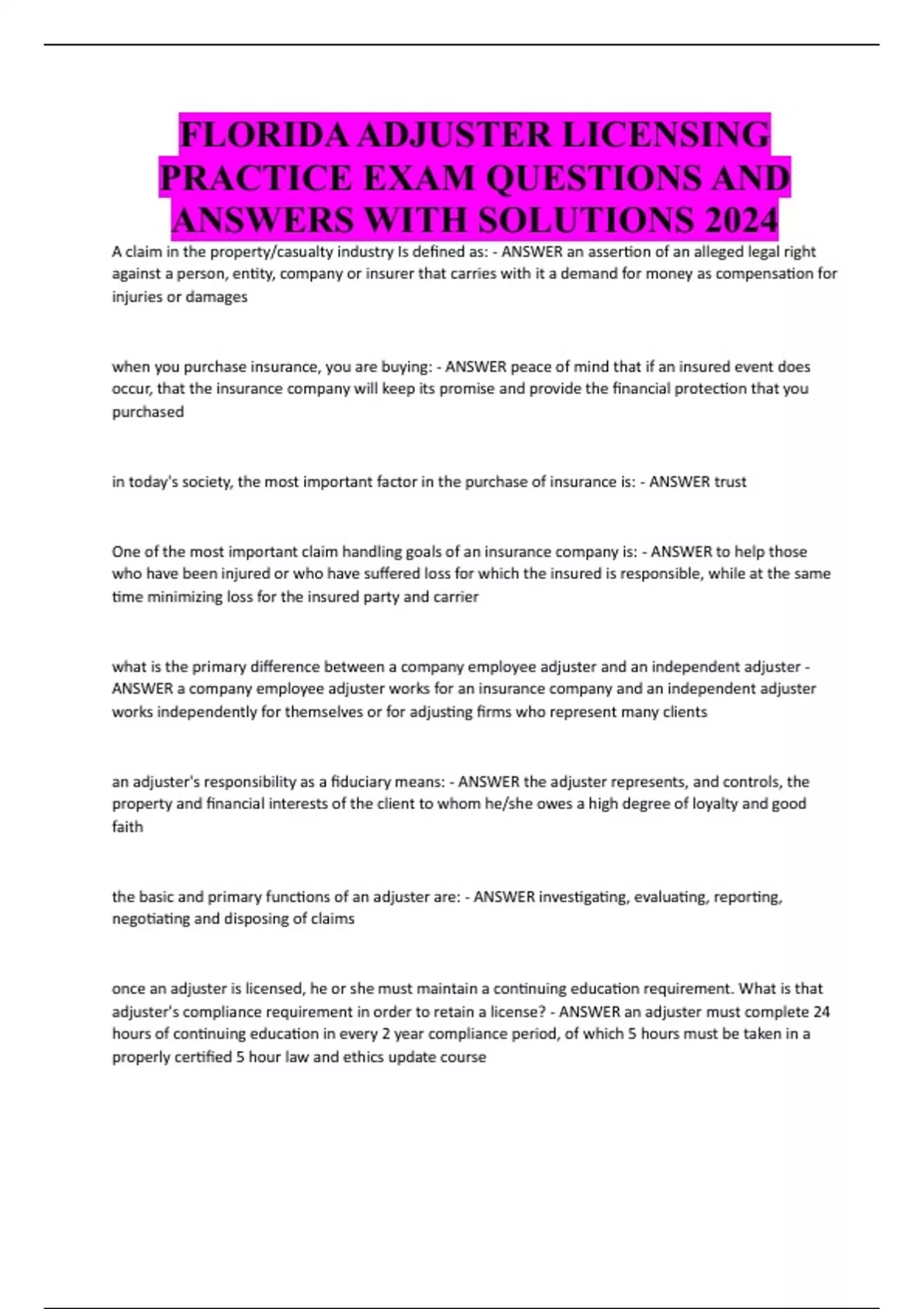 FLORIDA ADJUSTER LICENSING PRACTICE EXAM QUESTIONS AND ANSWERS WITH SOLUTIONS 2024