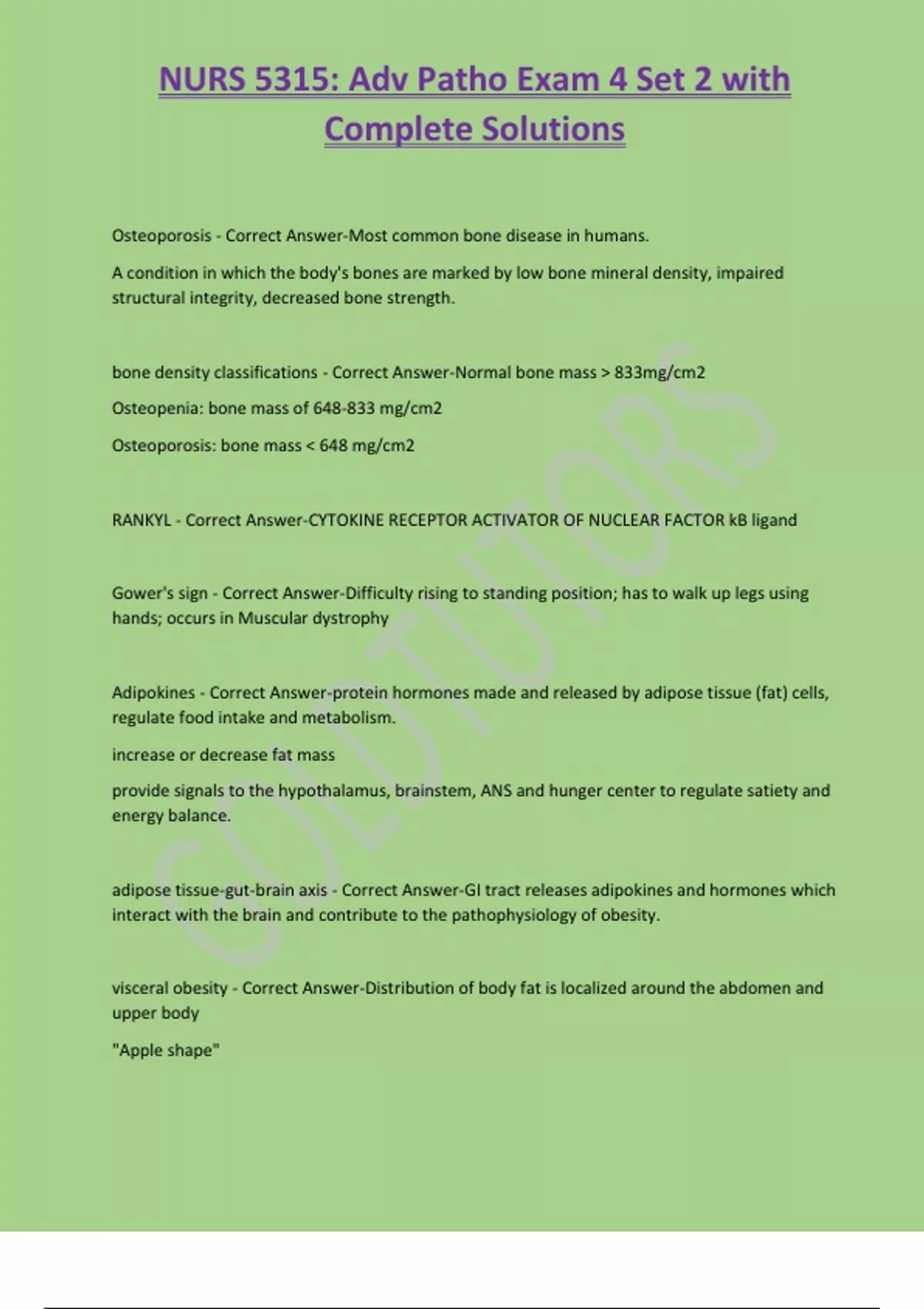 NURS 5315: Adv Patho Exam 4 Set 2 with Complete Solutions Osteoporosis - Correct Answer-Most common bone disease in humans. A condition in which the body's bones are marked by low bone mineral density, impaired structural integrity, decreased bone strength. bone density classifications - Correct Answer-Normal bone mass > 833mg/cm2 Osteopenia: bone mass of 648-833 mg/cm2 Osteoporosis: bone mass < 648 mg/cm2 RANKYL - Correct Answer-CYTOKINE RECEPTOR ACTIVATOR OF NUCLEAR FACTOR kB ligand