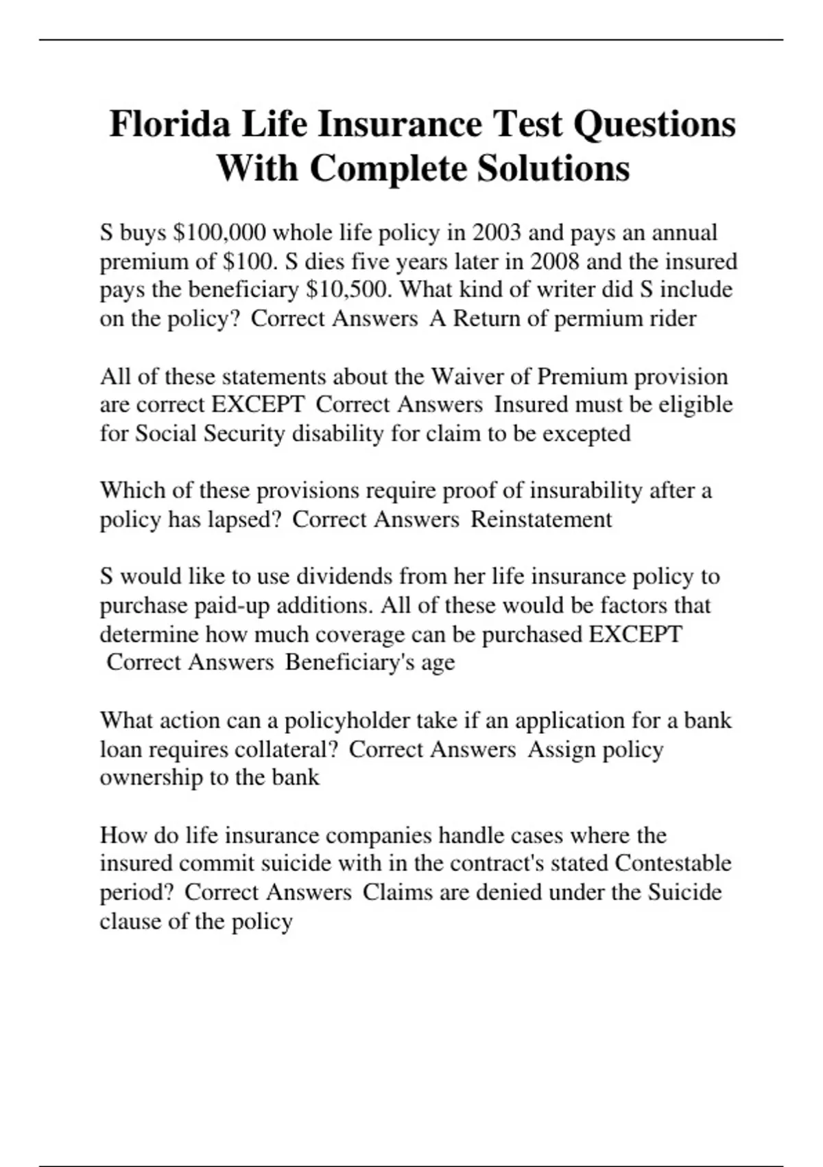 Florida Life Insurance Test Questions With Complete Solutions