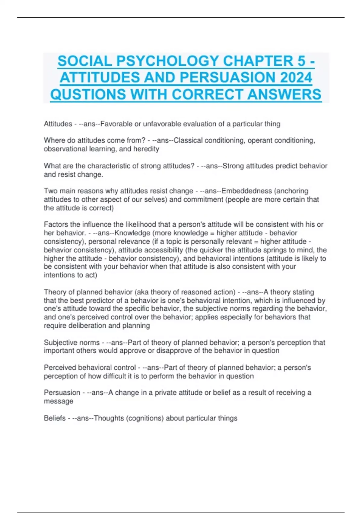 SOCIAL PSYCHOLOGY CHAPTER 5 - ATTITUDES AND PERSUASION 2024 QUSTIONS WITH CORRECT ANSWERS