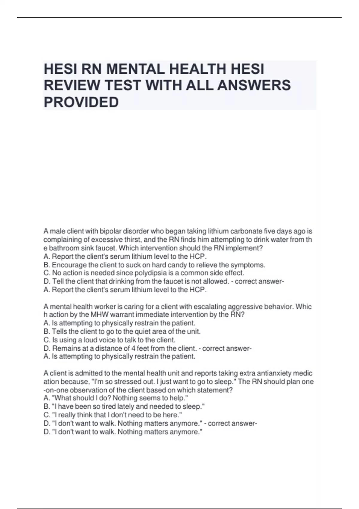 HESI RN MENTAL HEALTH HESI REVIEW TEST WITH ALL ANSWERS PROVIDED