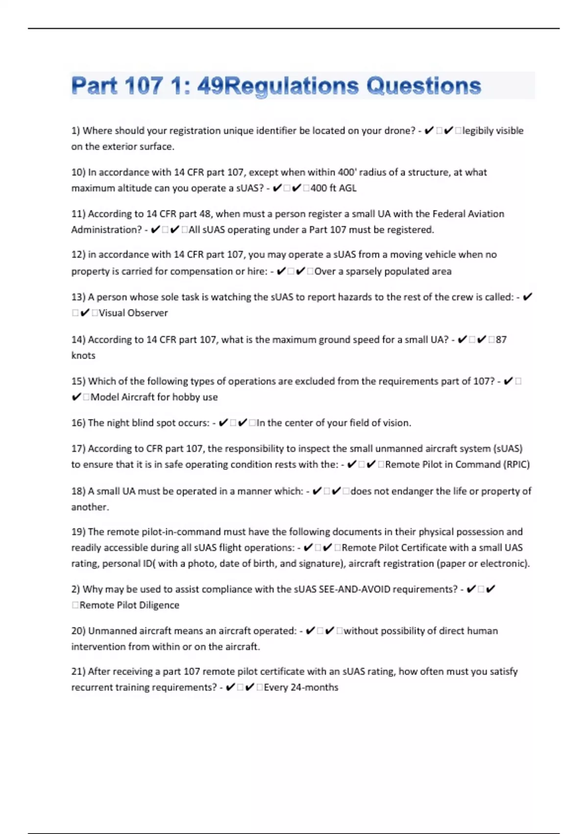 1) Where should your registration unique identifier be located on your drone? - ️️legibily visible on the exterior surface. 10) In accordance with 14 CFR part 107, except when within 400' radius of a structure, at what maximum altitude can you operate a sUAS? - ️️400 ft AGL 11) According to 14 CFR part 48, when must a person register a small UA with the Federal Aviation Administration? - ️️All sUAS operating under a Part 107 must be registered. 12) in accordance with 14 CFR part 107, you may operate a sUAS from a moving vehicle when no property is carried for compensation or hire: - ️️Over a sparsely populated area 13) A person whose sole task is watching the sUAS to report hazards to the rest of the crew is called: - ️️Visual Observer 14) According to 14 CFR part 107, what is the maximum ground speed for a small UA? - ️️87 knots 15) Which of the following types of operations are excluded from the requirements part of 107? - ️️Model Aircraft for hobby use 16) The night blind spot occurs: - ️️In the center of your field of vision. 17) According to CFR part 107, the responsibility to inspect the small unmanned aircraft system (sUAS) to ensure that it is in safe operating condition rests with the: - ️️Remote Pilot in Command (RPIC) 18) A small UA must be operated in a manner which: - ️️does not endanger the life or property of another. 19) The remote pilot-in-command must have the following documents in their physical possession and readily accessible during all sUAS flight operations: - ️️Remote Pilot Certificate with a small UAS rating, personal ID( with a photo, date of birth, and signature), aircraft registration (paper or electronic). 2) Why may be used to assist compliance with the sUAS SEE-AND-AVOID requirements? - ️️Remote Pilot Diligence 20) Unmanned aircraft means an aircraft operated: - ️️without possibility of direct human intervention from within or on the aircraft. 21) After receiving a part 107 remote pilot certificate with an sUAS rating, how often must you satisfy recurrent training requirements? - ️️Every 24-months