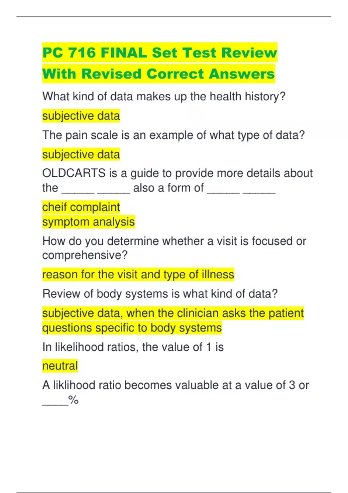 PC 716 FINAL Set Test Review With Revised Correct Answers What kind of data makes up the health history? subjective data The pain scale is an example of what type of data? subjective data OLDCARTS is a guide to provide more details about the _____ _____ also a form of _____ _____ cheif complaint symptom analysis How do you determine whether a visit is focused or comprehensive? reason for the visit and type of illness Review of body systems is what kind of data? subjective data, when the clinician asks the patient questions specific to body systems In likelihood ratios, the value of 1 is neutral A liklihood ratio becomes valuable at a value of 3 or ____% +20% A liklihood ratio becomes useful at a value of 0.3 or ____% -25%
