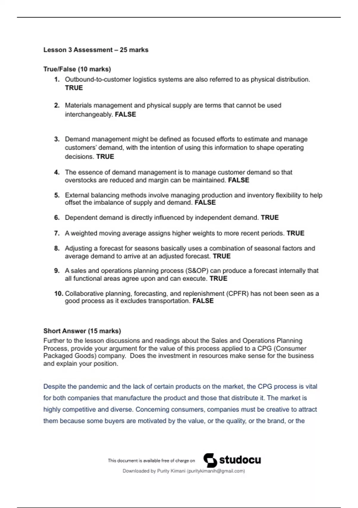 Lesson 3 Assessment – 25 marksTrue/False (10 marks)1. Outbound-to-customer logistics systems are also referred to as physical distribution. TRUE2. Materials management and physical supply are terms that cannot be used interchangeably. FALSE3. Demand management might be defined as focused efforts to estimate and manage customers’ demand, with the intention of using this information to shape operating decisions. TRUE4. The essence of demand management is to manage customer demand so that overstocks are reduced and margin can be maintained. FALSE5. Extern