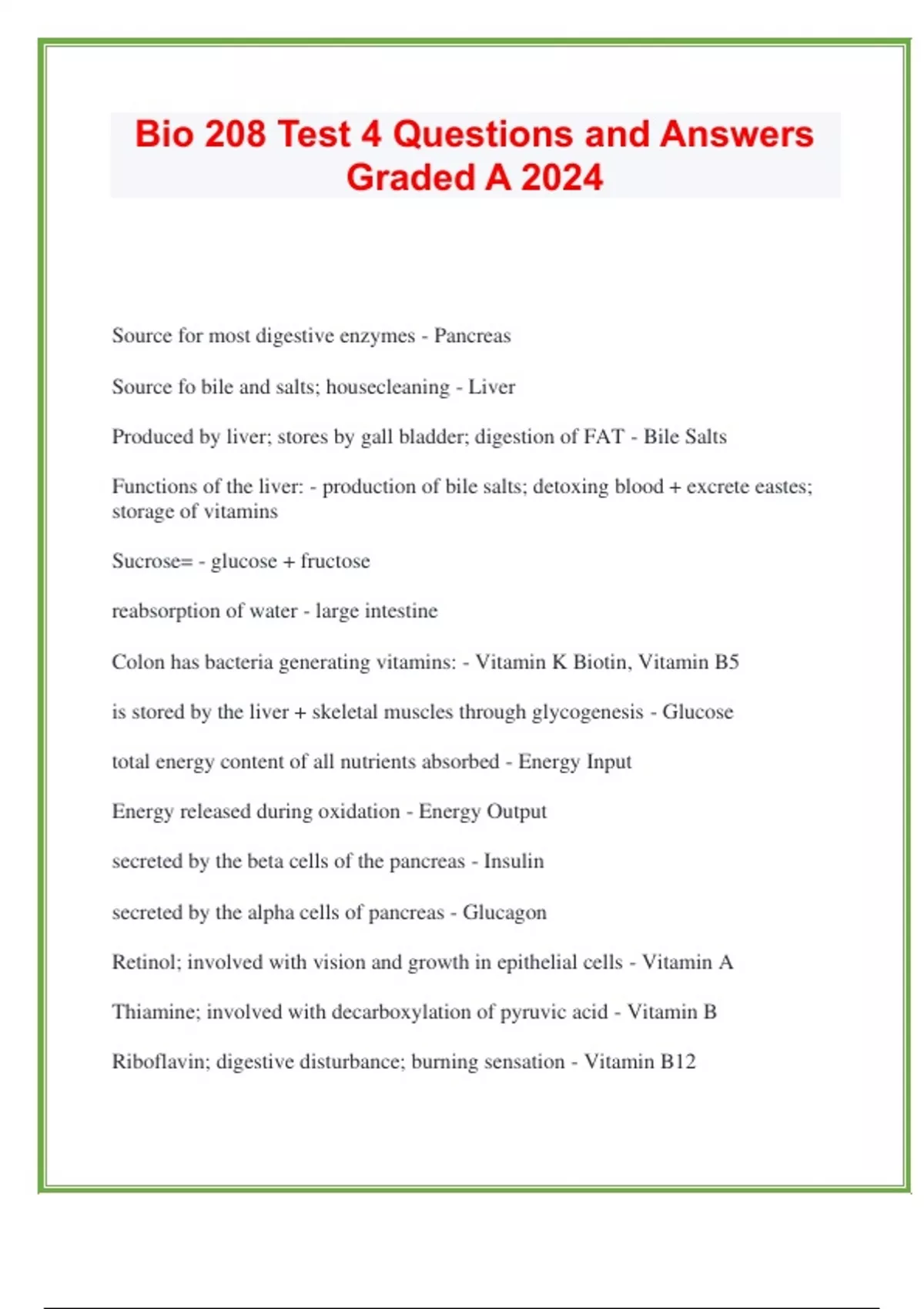 Source for most digestive enzymes - Pancreas Source fo bile and salts; housecleaning - Liver Produced by liver; stores by gall bladder; digestion of FAT - Bile Salts Functions of the liver: - production of bile salts; detoxing blood + excrete eastes; storage of vitamins Sucrose= - glucose + fructose reabsorption of water - large intestine Colon has bacteria generating vitamins: - Vitamin K Biotin, Vitamin B5 is stored by the liver + skeletal muscles through glycogenesis - Glucose total energy content of all nutrients absorbed - Energy Input Energy released during oxidation - Energy Output secreted by the beta cells of the pancreas - Insulin secreted by the alpha cells of pancreas - Glucagon Retinol; involved with vision and growth in epithelial cells - Vitamin A Thiamine; involved with decarboxylation of pyruvic acid - Vitamin B Riboflavin; digestive disturbance; burning sensation - Vitamin B12 Nicotonic Acid; muscle weakness, GI problems - Niagn Pyridoxine; involved with transport of amino acids across membranes; protein + lipid metabolism; seizures - Vitamin B6 Cobalt; involved with DNA synthesis; paralysis - Vitamin B12 Folacin; DNA formation - Folic Acid Involved with carbohydrate + fat metabolism; retarded growth; reproductive failure - Pantothenic Acid B5 Ascorbic; involved with formation of collagen (ligaments + CT as well as bone + teeth) - Vitamin C Calciferol; involved w/ Ca++ absorption from GI tract - Vitamin D Tocopherol; involved with preventing oxidation of unsaturated fats; fetal miscarriage - Vitamin E formation of prothrombin by the liver as well as factors VII, IX, and V - Vitamin K Functions of the kidney: - water + electrolyte balance; Excretion of the kidney: - metabolic waste products; foreign chemicals; secretion of hormones and Vitamin D Rivals that of liver during fasting - Gluconegenesis Produces urine - kidney transports urine toward the urinary bladder - Ureter temporarily stores urine prior to elimination - urinary bladder conducts urine to exterior - Urethra is the basic functional unit of the kidney - Nephron provides filtrate for processing - glomerus capillary bed