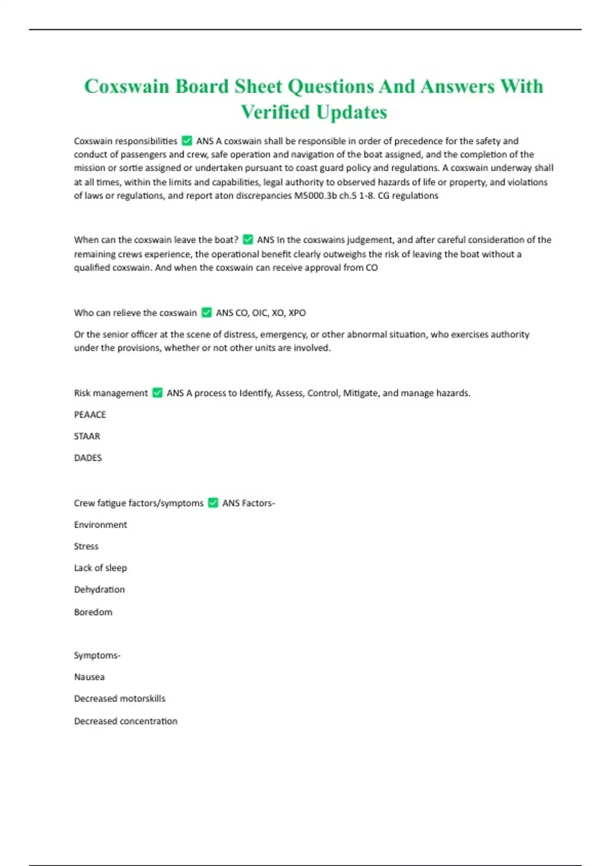 Coxswain Board Sheet Questions And Answers With Verified Updates