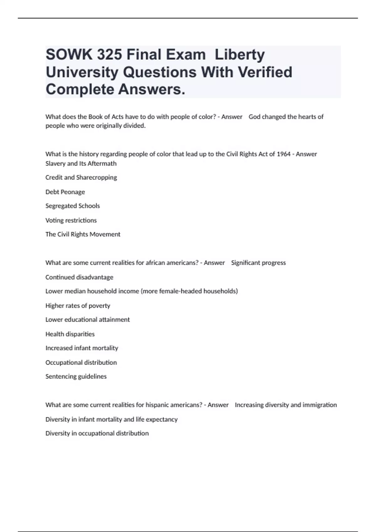 What does the Book of Acts have to do with people of color? - Answer God changed the hearts of people who were originally divided. What is the history regarding people of color that lead up to the Civil Rights Act of 1964 - Answer Slavery and Its Aftermath Credit and Sharecropping Debt Peonage Segregated Schools Voting restrictions The Civil Rights Movement What are some current realities for african americans? - Answer Significant progress Continued disadvantage Lower median household income (more female-headed households) Higher rates of poverty Lower educational attainment Health disparities Increased infant mortality Occupational distribution Sentencing guidelines What are some current realities for hispanic americans? - Answer Increasing diversity and immigration Diversity in infant mortality and life expectancy Diversity in occupational distribution