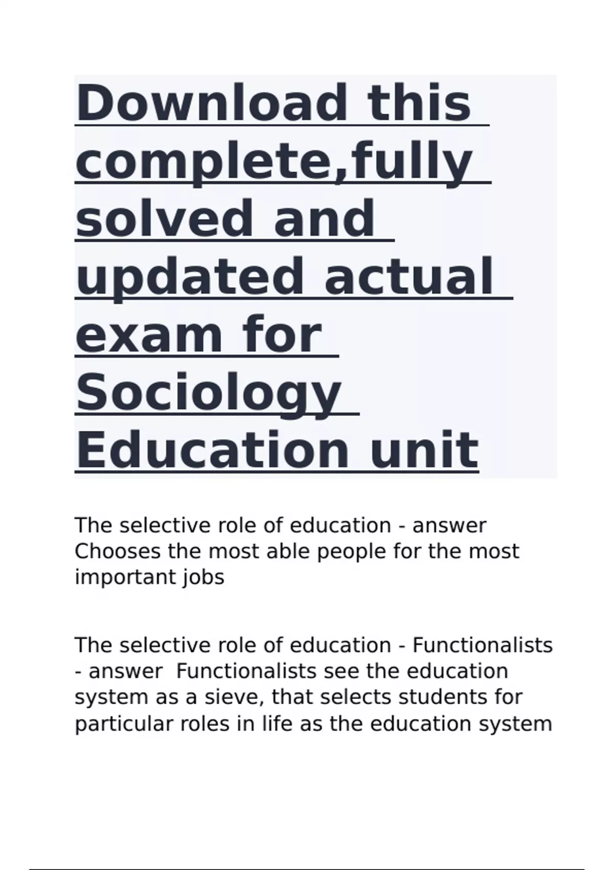 Download this complete,fully solved and updated actual exam for Sociology Education unit