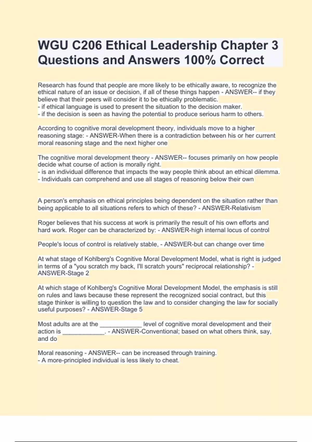 WGU C206 Ethical Leadership Chapter 3 Questions and Answers 100% CorrectWGU C206 Ethical Leadership Chapter 3 Questions and Answers 100% CorrectWGU C206 Ethical Leadership Chapter 3 Questions and Answers 100% CorrectResearch has found that people are more likely to be ethically aware, to recognize the ethical nature of an issue or decision, if all of these things happen - ANSWER-- if they believe that their peers will consider it to be ethically problematic. - if ethical language is used to present the situation to the decision maker. - if the decision is seen as having the potential to produce serious harm to others. According to cognitive moral development theory, individuals move to a higher reasoning stage: - ANSWER-When there is a contradiction between his or her current moral reasoning stage and the next higher one
