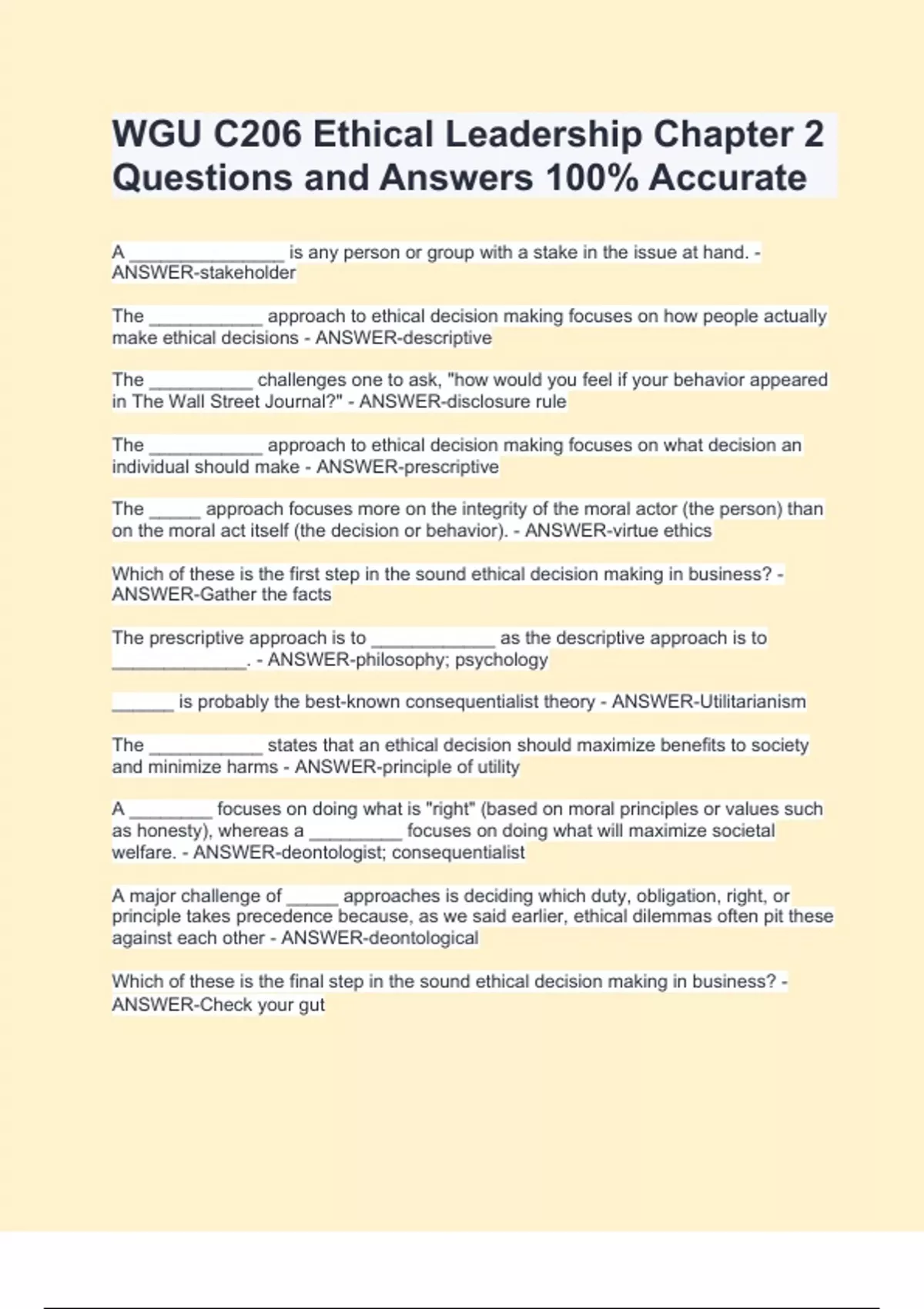 WGU C206 Ethical Leadership Chapter 2 Questions and Answers 100% AccurateWGU C206 Ethical Leadership Chapter 2 Questions and Answers 100% AccurateWGU C206 Ethical Leadership Chapter 2 Questions and Answers 100% AccurateA _______________ is any person or group with a stake in the issue at hand. - ANSWER-stakeholder The ___________ approach to ethical decision making focuses on how people actually make ethical decisions - ANSWER-descriptive