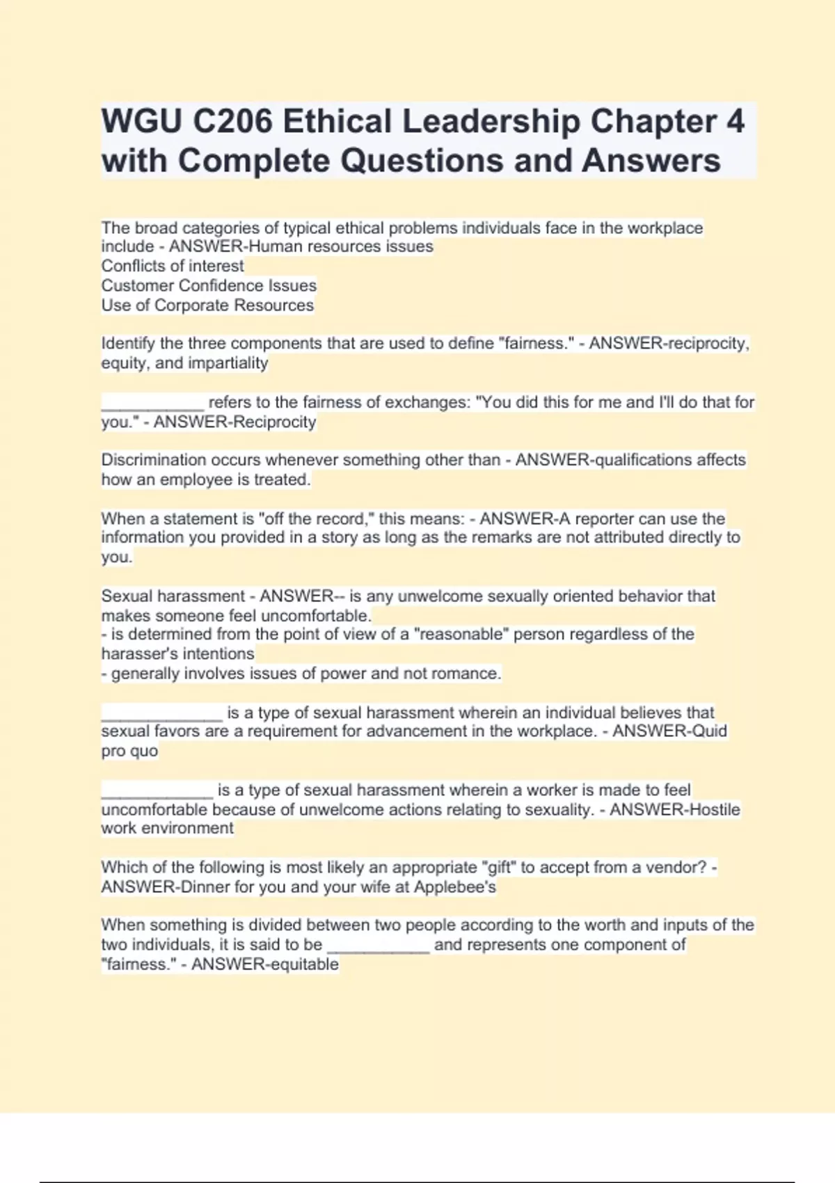 WGU C206 Ethical Leadership Chapter 4 with Complete Questions and AnswersWGU C206 Ethical Leadership Chapter 4 with Complete Questions and AnswersWGU C206 Ethical Leadership Chapter 4 with Complete Questions and Answers The broad categories of typical ethical problems individuals face in the workplace include - ANSWER-Human resources issues Conflicts of interest Customer Confidence Issues Use of Corporate Resources Identify the three components that are used to define "fairness." - ANSWER-reciprocity, equity, and impartiality