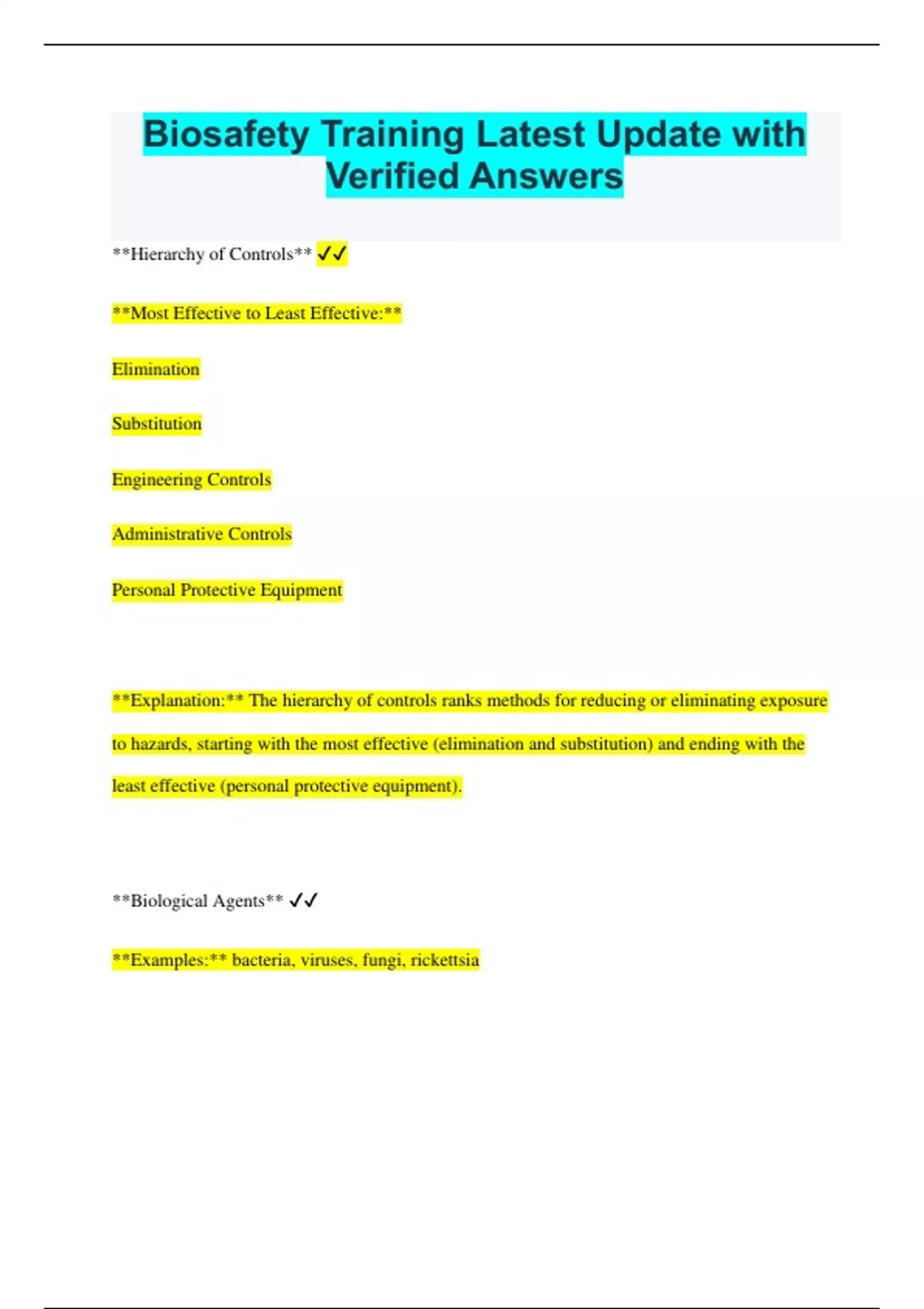 Biosafety Training Latest Update with Verified Answers **Hierarchy of Controls** **Most Effective to Least Effective:** Elimination Substitution Engineering Controls Administrative Controls Personal Protective Equipment **Explanation:** The hierarchy of controls ranks methods for reducing or eliminating exposure to hazards, starting with the most effective (elimination and substitution) and ending with the least effective (personal protective equipment). **Biological Agents** **Examples:** bacteria, viruses, fungi, rickettsia **Explanation:** Biological agents include a range of microorganisms such as bacteria, viruses, fungi, and rickettsia, each with unique characteristics and potential health risks. **Biologic Agents' Routes of Exposure** **Routes:** ingestion, inhalation, mucous membrane exposure, inoculation **Explanation:** Biological agents can enter the body through different routes, including ingestion, inhalation, exposure to mucous membranes, and inoculation through breaks in the skin. **Biosafety Levels** **High Risk to Low Risk:** BSL-4 BSL-3 BSL-2 BSL-1 **Explanation:** Biosafety Levels (BSL) categorize laboratories based on the pathogens handled, ranging from BSL-4 (highest containment for dangerous pathogens) to BSL-1 (basic containment for agents unlikely to cause disease in healthy individuals). **Risk Group 1** **Characteristics:** Agents not associated with disease in healthy adult humans **Explanation:** Risk Group 1 pathogens do not cause disease in healthy individuals and pose minimal risk under standard laboratory conditions. **Risk Group 2** **Characteristics:** Agents associated with human disease that is rarely serious and for which preventative or therapeutic interventions are often available **Explanation:** Risk Group 2 pathogens can cause disease in humans, but the diseases are generally mild or treatable, posing moderate risk in laboratory