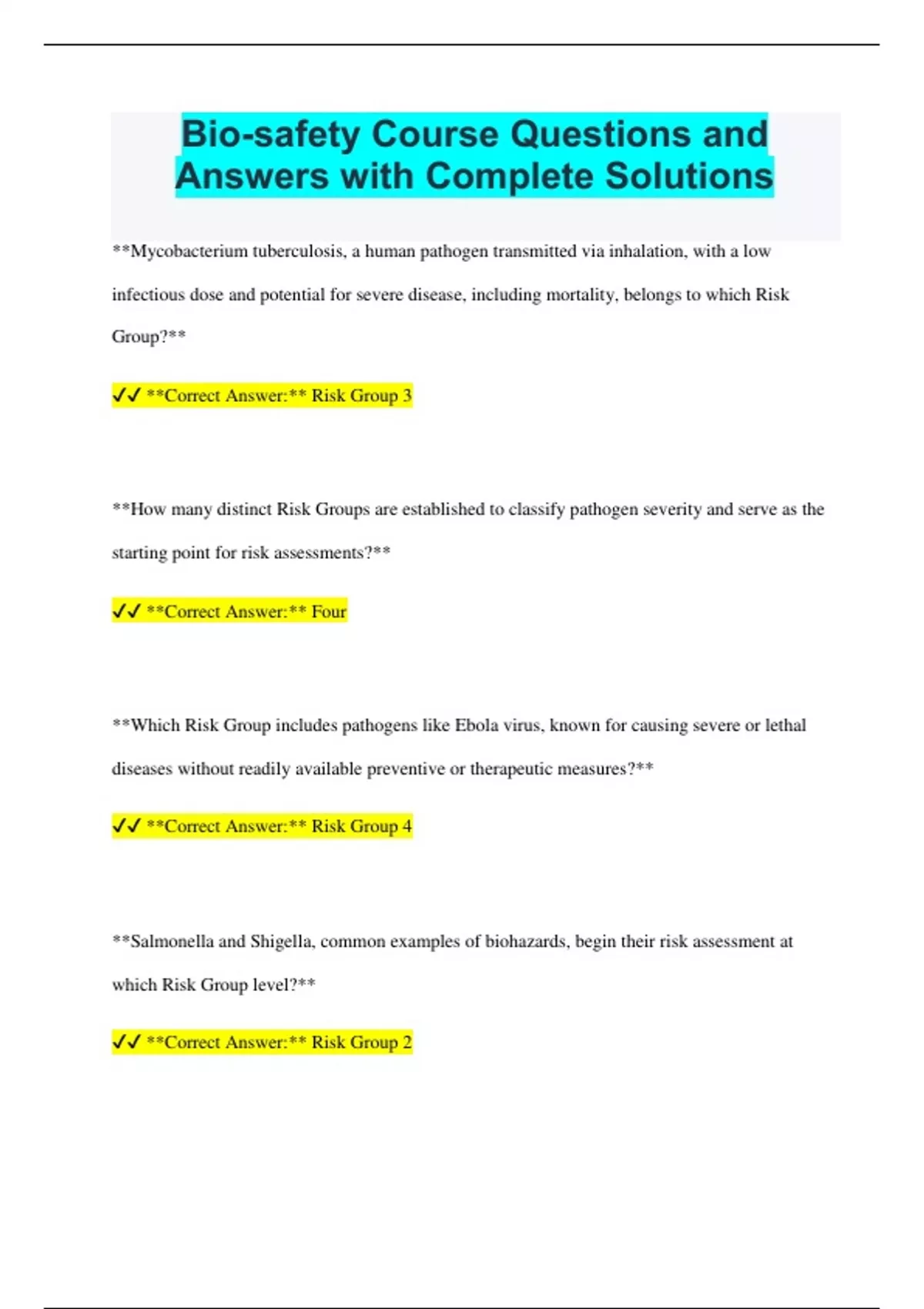 Bio-safety Course Questions and Answers with Complete Solutions **Mycobacterium tuberculosis, a human pathogen transmitted via inhalation, with a low infectious dose and potential for severe disease, including mortality, belongs to which Risk Group?** **Correct Answer:** Risk Group 3 **How many distinct Risk Groups are established to classify pathogen severity and serve as the starting point for risk assessments?** **Correct Answer:** Four **Which Risk Group includes pathogens like Ebola virus, known for causing severe or lethal diseases without readily available preventive or therapeutic measures?** **Correct Answer:** Risk Group 4 **Salmonella and Shigella, common examples of biohazards, begin their risk assessment at which Risk Group level?** **Correct Answer:** Risk Group 2 **This Biosafety Level mandates at least two-door separation between biohazard areas and nonresearch personnel, requires inward airflow, and includes visual airflow verification.** **Correct Answer:** BSL3 **Regarding U.S. biohazard regulations, which statement accurately reflects compliance under the OSHA General Duty Clause in research laboratories?** **Correct Answer:** The OSHA General Duty Clause (Section 5A1) applies to biohazards in research settings. **In Gwladys Caspars' Risk Group Comparison Table, the precaution "don't touch it" applies to pathogens classified under which Risk Group?** **Correct Answer:** Risk Group 2 **How many Biosafety Levels have been established to define recommended practices for containing biological hazards and designing laboratory facilities?** **Correct Answer:** Four **Salmonella and Shigella are categorized under which Risk Group due to their potential as human pathogens?** **Correct Answer:** Risk Group 2 **True or False: Principal Investigators are required to establish a Risk Group classification for pathogens used in research due to the absence of globally published lists for human pathogens.** **Correct Answer:** False **True or False: Researchers are exempt from formal risk assessments if they wear basic personal protective equipment such as gloves, lab coats,
