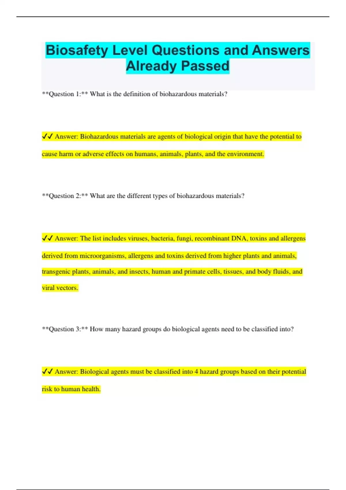 Biosafety Level Questions and Answers Already Passed **Question 1:** What is the definition of biohazardous materials? Answer: Biohazardous materials are agents of biological origin that have the potential to cause harm or adverse effects on humans, animals, plants, and the environment. **Question 2:** What are the different types of biohazardous materials? Answer: The list includes viruses, bacteria, fungi, recombinant DNA, toxins and allergens derived from microorganisms, allergens and toxins derived from higher plants and animals, transgenic plants, animals, and insects, human and primate cells, tissues, and body fluids, and viral vectors. **Question 3:** How many hazard groups do biological agents need to be classified into? Answer: Biological agents must be classified into 4 hazard groups based on their potential risk to human health. **Question 4:** What are the characteristics of each hazard group? Answer: Group 1: unlikely to cause human disease; Group 2: can cause human disease but is unlikely to spread to the community and has effective treatment and prevention measures; Group 3: causes severe human disease but has effective treatment and prevention measures; Group 4: causes severe human disease and has no effective treatment or prevention measures. **Question 5:** What is the minimum containment level required for each hazard group? Answer: Hazard Group 1 requires BSL 1, Hazard Group 2 requires BSL 2, Hazard Group 3 requires BSL 3, and Hazard Group 4 requires BSL 4. **Question 6:** What does containment refer to in the context of biohazardous materials? Answer: Containment refers to the safe methods for managing infectious materials in a laboratory environment where they are being handled or maintained. What are the "Good Microbiological Techniques (GMT)"? - using proper aseptic techniques; - wearing appropriate personal protective equipment (PPE); - minimizing the production of aerosols or working in a biological safety cabinet (BSC) when aerosol production is unavoidable; - employing universal precautions with blood borne pathogens; - routinely disinfecting work surfaces and equipment/supplies used in the experiment; - immediately cleaning spills according to laboratory protocols; - restricting work with infectious material to one