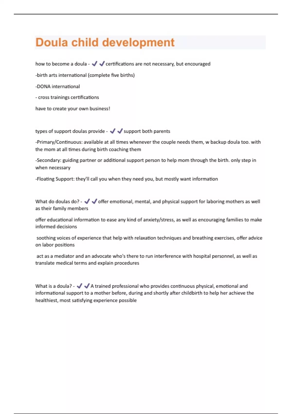how to become a doula - certifications are not necessary, but encouraged -birth arts international (complete five births) -DONA international - cross trainings certifications have to create your own business! types of support doulas provide - support both parents -Primary/Continuous: available at all times whenever the couple needs them, w backup doula too. with the mom at all times during birth coaching them -Secondary: guiding partner or additional support person to help mom through the birth. only step in when necessary -Floating Support: they'll call you when they need you, but mostly want information What do doulas do? - offer emotional, mental, and physical support for laboring mothers as well as their family members offer educational information to ease any kind of anxiety/stress, as well as encouraging families to make informed decisions soothing voices of experience that help with relaxation techniques and breathing exercises, offer advice on labor positions act as a mediator and an advocate who's there to run interference with hospital personnel, as well as translate medical terms and explain procedures What is a doula? - A trained professional who provides continuous physical, emotional and informational support to a mother before, during and shortly after childbirth to help her achieve the healthiest, most satisfying experience possible