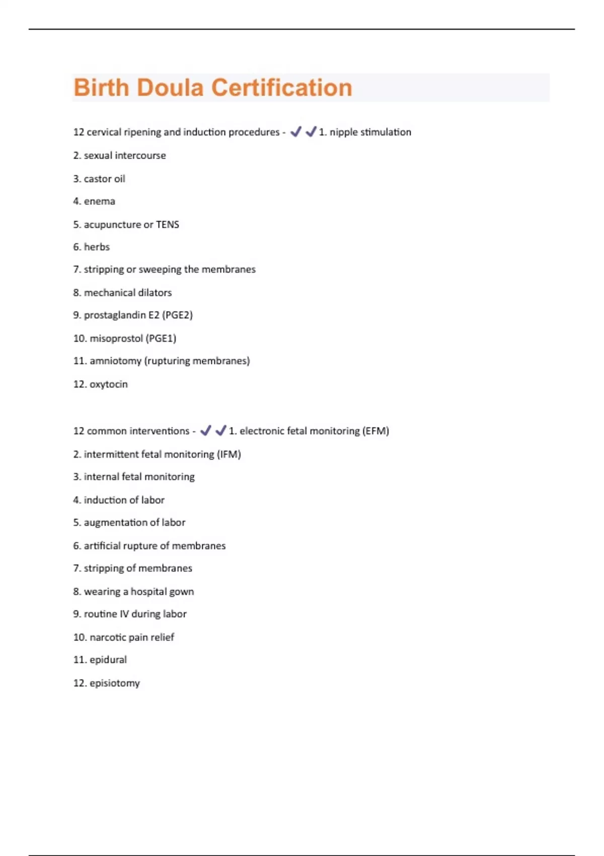 12 cervical ripening and induction procedures - 1. nipple stimulation 2. sexual intercourse 3. castor oil 4. enema 5. acupuncture or TENS 6. herbs 7. stripping or sweeping the membranes 8. mechanical dilators 9. prostaglandin E2 (PGE2) 10. misoprostol (PGE1) 11. amniotomy (rupturing membranes) 12. oxytocin 12 common interventions - 1. electronic fetal monitoring (EFM) 2. intermittent fetal monitoring (IFM) 3. internal fetal monitoring 4. induction of labor 5. augmentation of labor 6. artificial rupture of membranes 7. stripping of membranes 8. wearing a hospital gown 9. routine IV during labor 10. narcotic pain relief 11. epidural 12. episiotomy4 touch techniques - 1. effleurage 2. counter pressure 3. double hip squeeze 4. kneading massage 6 relaxation techniques - 1. visualization & affirmations 2. deep, slow breathing 3. progressive relaxation 4. setting the environment 5. breathing 6. rainbow script 9 positions of comfort - 1. side-lying 2. hands and knees 3. standing (slow dancing) / swaying 4. walking 5. sitting 6. squatting 7. birthing stool 8. birth ball 9. shower or bath amniotomy - artificial rupture of membranes usually an attempt to shorten labor birth ball - can be used throughout entire labor with many positions helps decrease pain, promotes comfort, great if mom is having back labor and allows baby to get in goof position using gravitythere should always be support person around so mom doesn't fall off; also need a ball that fits mom's height can rock back and forth, side-to-side in between contractions mom can rest head on a pillow giving gentle pressure on lower back is helpful during contractions and giving lower back massage between contractions there are also small birthing balls that can be used to rock while in hands and knees position on bed-- caregiver can do the same things here (pressure and massage) birthing stool - sit in upright position allows for partner/doula to massage back if mom is having back pain could also apply pressure to lower back or massage lower back can also give birth on birthing stool if right for mom breathing - cleansing breath (before and after contraction): deep breath in through the nose and out through the mouth slow breathing (during contraction): finishing contraction with a cleansing breath light breathing (during contraction): breath in and out rapidly. between the contractions, mom should sip on water, suck on ice chips --put those together: begin contraction with slow breathing, as contraction ramps up switch to light breathing and after the contraction ends take a nice cleansing breath. if contraction starts of super heavy/strong, skip the slow breath. cephalopelvic disproportion - condition preventing normal delivery through the birth canal; either the baby's head is too large or the birth canal is too smallcertified nurse midwife (CNM) - trained in nursing and midwifery care for women during pregnancy, labor, and delivery most CNM's: - have a bachelors degree in nursing - have a masters degree in midwifery - are certified by the American College of nurse-midwives most CNM's work with OB's