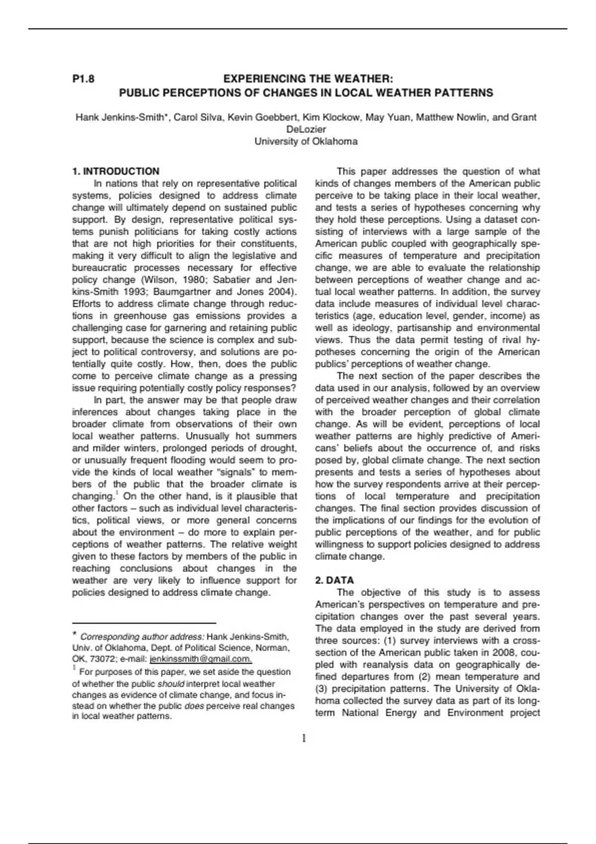INTRODUCTION In nations that rely on representative political systems, policies designed to address climate change will ultimately depend on sustained public support. By design, representative political systems punish politicians for taking costly actions that are not high priorities for their constituents, making it very difficult to align the legislative and bureaucratic processes necessary for effective policy change (Wilson, 1980; Sabatier and Jenkins-Smith 1993; Baumgartner and Jones 2004). Efforts to address climate change through reductions in greenhouse gas emissions provides a challenging case for garnering and retaining public support, because the science is complex and subject to political controversy, and solutions are potentially quite costly. How, then, does the public come to perceive climate change as a pressing issue requiring potentially costly policy responses? In part, the answer may be that people draw inferences about changes taking place in the broader climate from observations of their own local weather patterns. Unusually hot summers and milder winters, prolonged periods of drought, or unusually frequent flooding would seem to provide the kinds of local weather “signals” to members of the public that the broader climate is changing.1 On the other hand, is it plausible that other factors – such as individual level characteristics, political views, or more general concerns about the environment – do more to explain perceptions of weather patterns. The relative weight given to these factors by members of the public in reaching conclusions about changes in the weather are very likely to influence support for policies designed to address climate change. * Corresponding author address: Hank Jenkins-Smith, Univ. of Oklahoma, Dept. of Political Science, Norman, OK, 73072; e-mail: . 1 For purposes of this paper, we set aside the question of whether the public should interpret local weather changes as evidence of climate change, and focus instead on whether the public does perceive real changes in local weather patterns. This paper addresses the question of what kinds of changes members of the American public perceive to be taking place in their local weather, and tests a series of hypotheses concerning why they hold these perceptions. Using a dataset consisting of interviews with a large sample of the American public coupled with geographically specific measures of temperature and precipitation change, we are able to evaluate the relationship between perceptions of weather change and actual local weather patterns. In addition, the survey data include measures of individual level characteristics (age, education level, gender, income) as well as ideology, partisanship and environmental views. Thus the data permit testing of rival hypotheses concerning the origin of the American publicsʼ perceptions of weather change. The next section of the paper describes the data used in our analysis, followed by an overview of perceived weather changes and their correlation with the broader perception of global climate change. As will be evident, perceptions of local weather patterns are highly predictive of Americansʼ beliefs about the occurrence of, and risks posed by, global climate change. The next section presents and tests a series of hypotheses about how the survey respondents arrive at their perceptions of local temperature and precipitation changes. The final section provides discussion of the implications of our findings for the evolution of public perceptions of the weather, and for public willingness to support policies designed to address climate change. 2. DATA The objective of this study is to assess Americanʼs perspectives on temperature and precipitation changes over the past several years. The data employed in the study are derived from three sources: (1) survey intervie