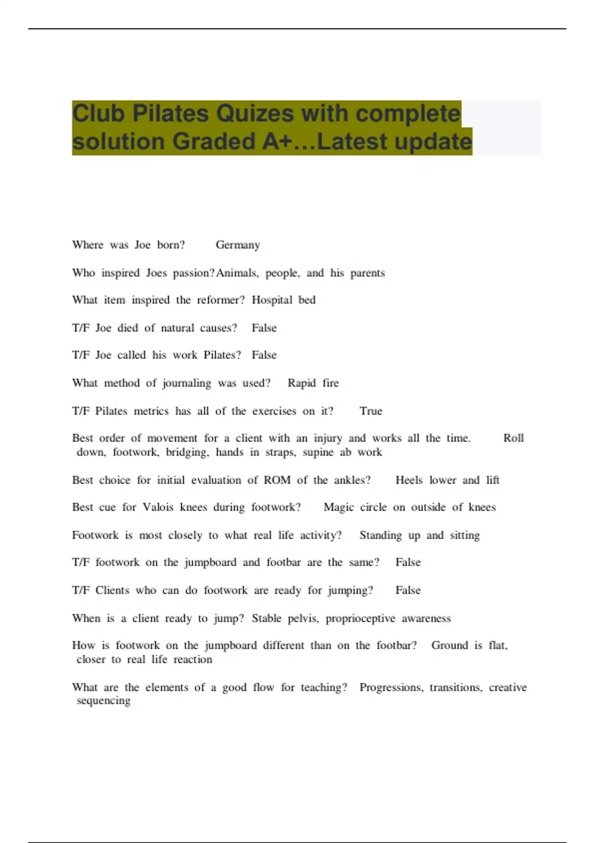 PACKAGE DEAL FOR>> Club Pilates Exam with complete solutions rated A …Updated|2024